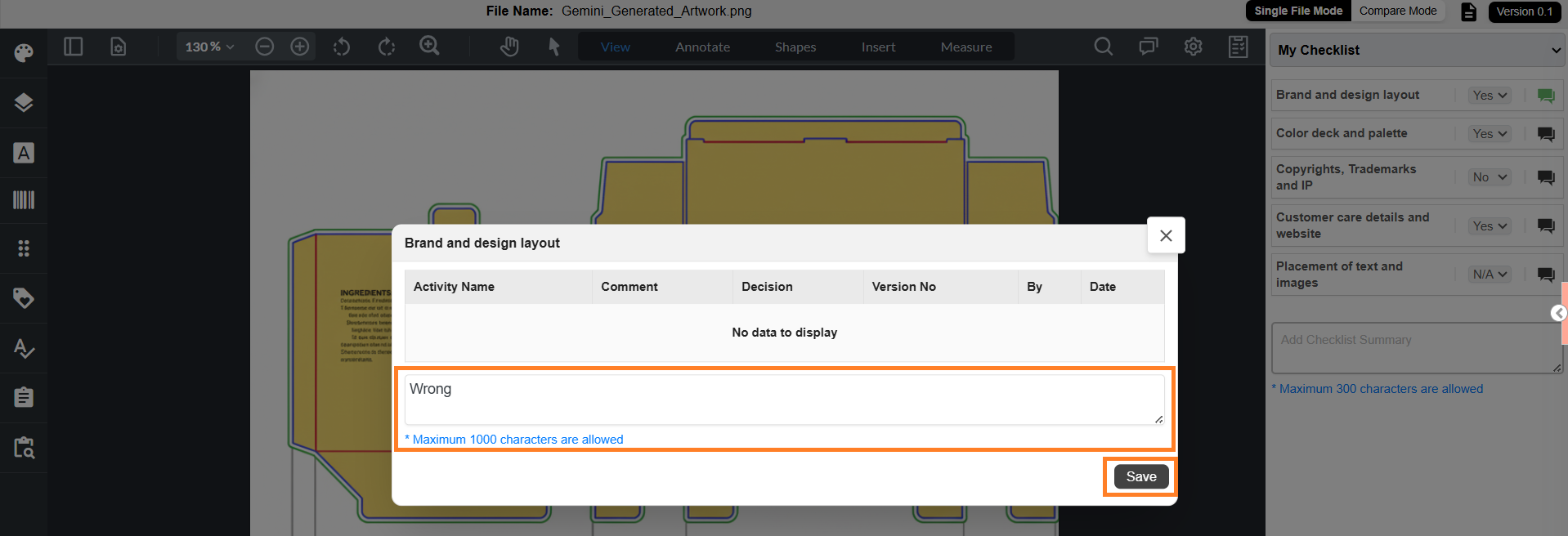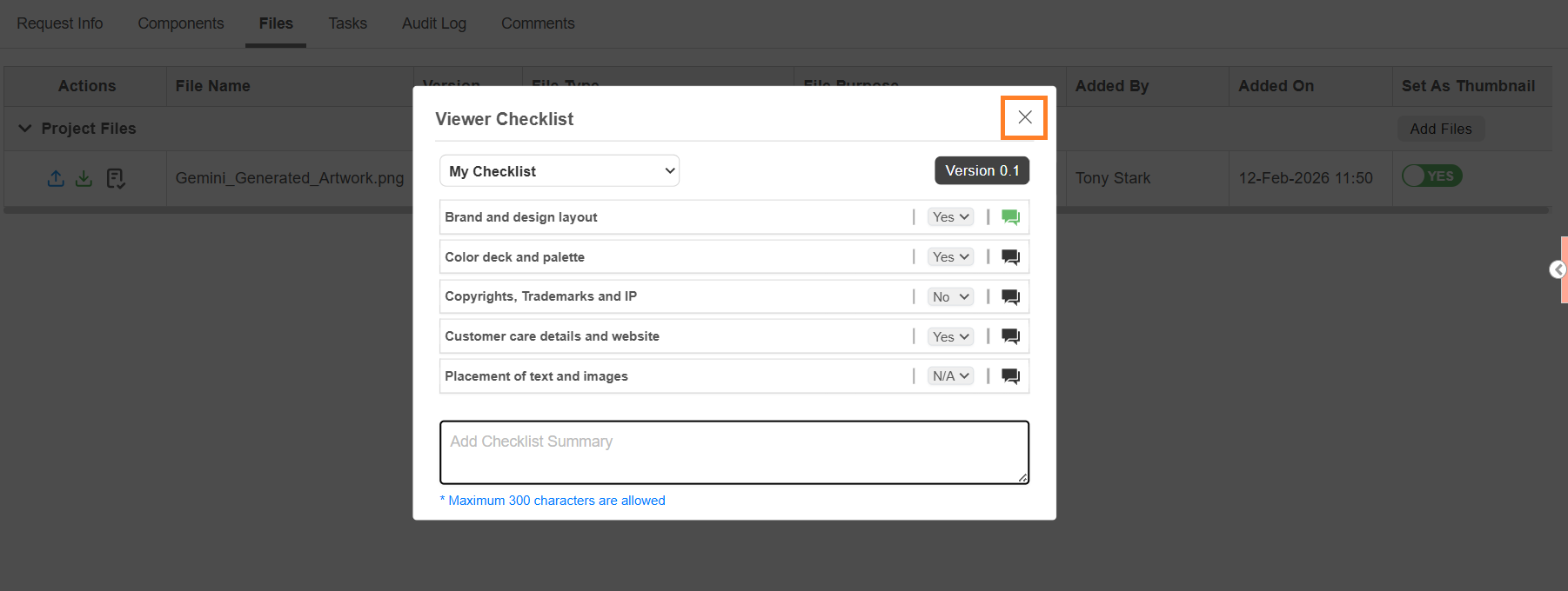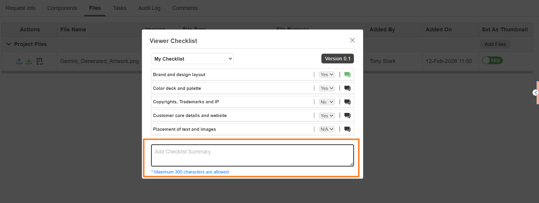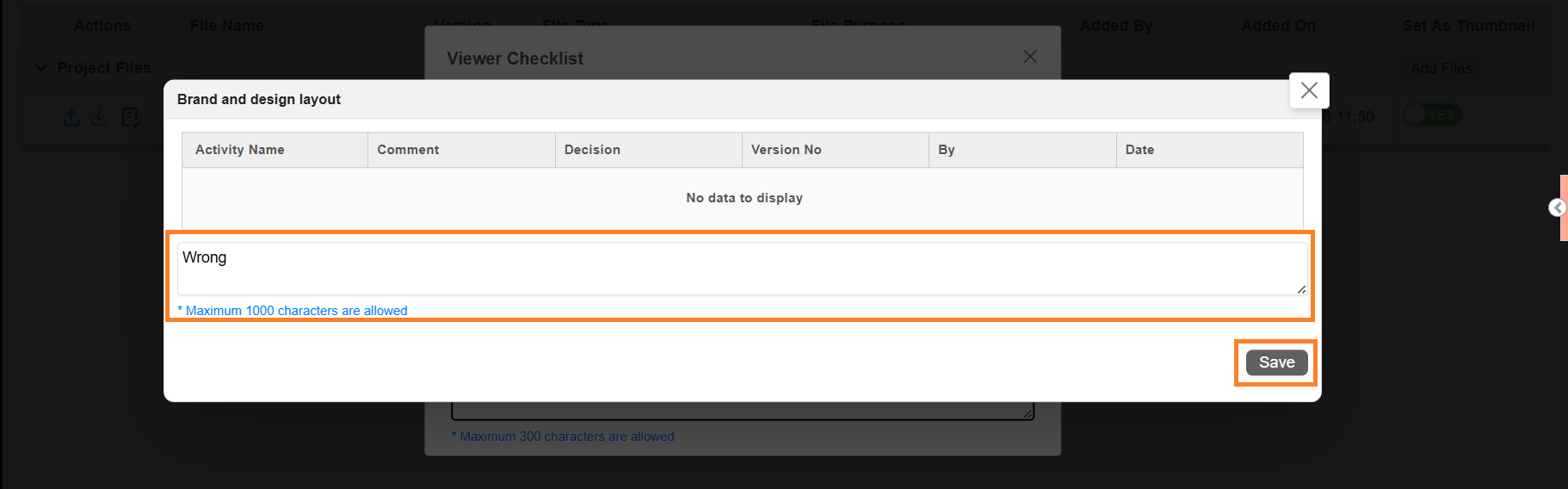 | Note: Maximum 1000 characters allowed. Comments are added to the Comments tab of the project. Comments can be downloaded with artwork annotations (if configured in Viewer Parameter Configuration). |