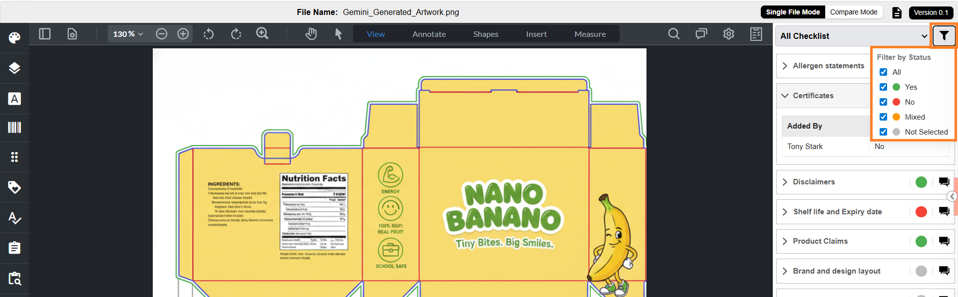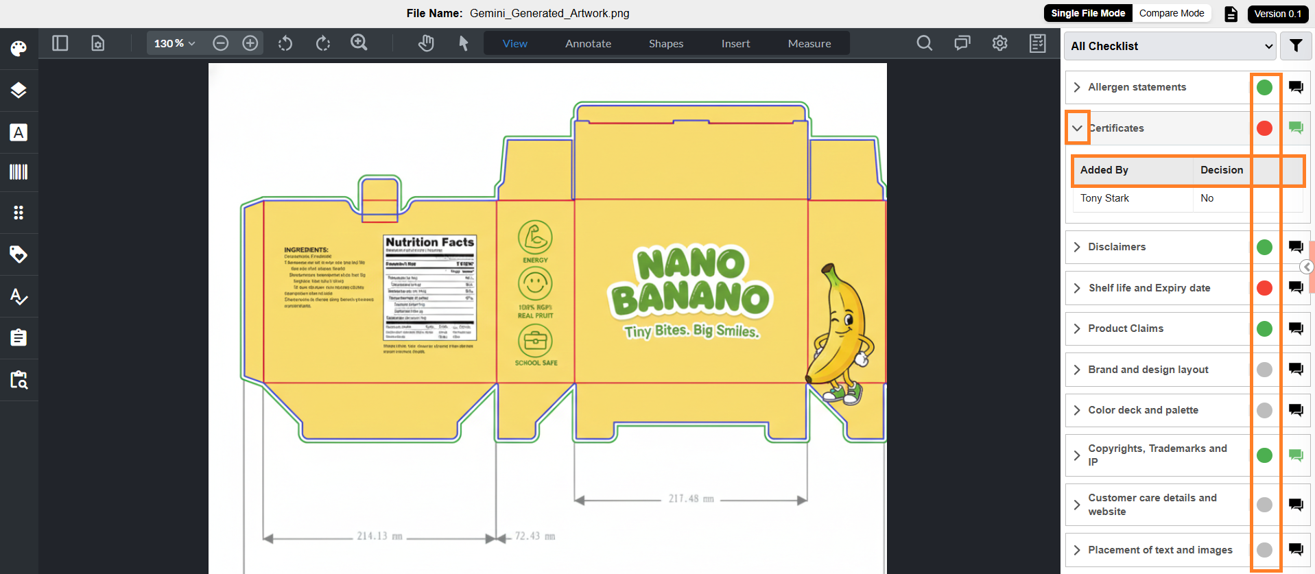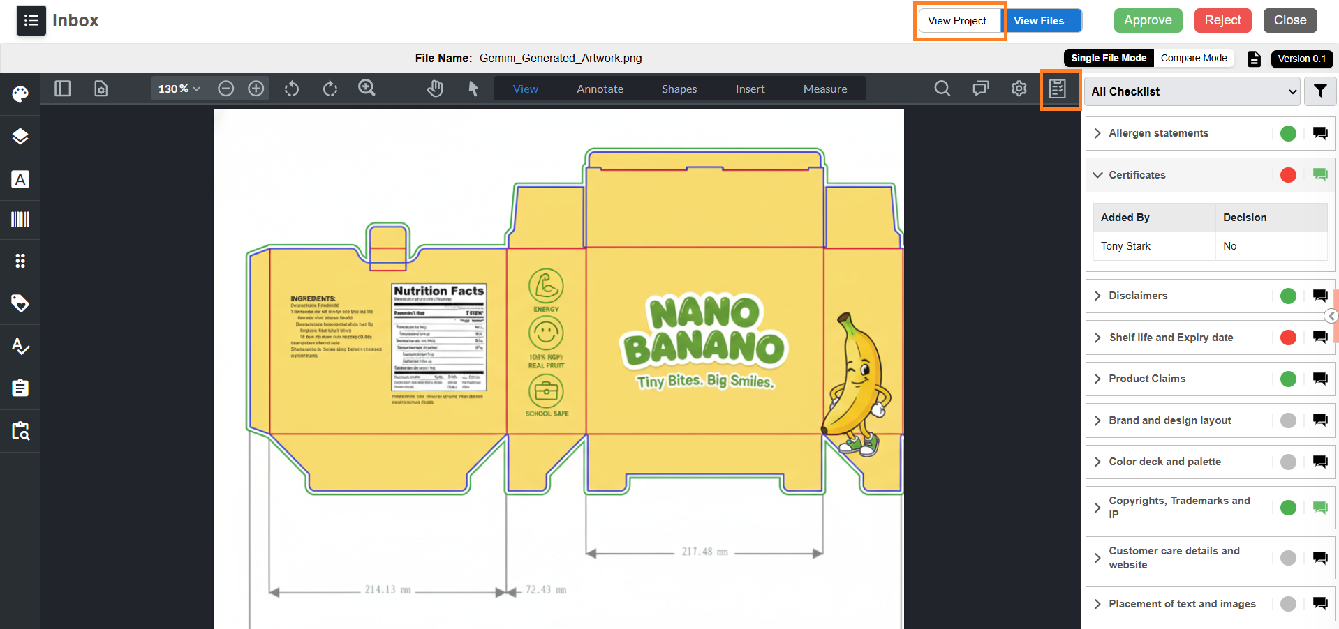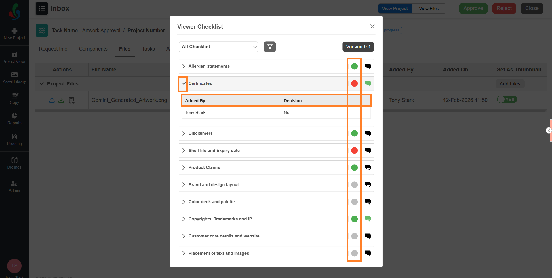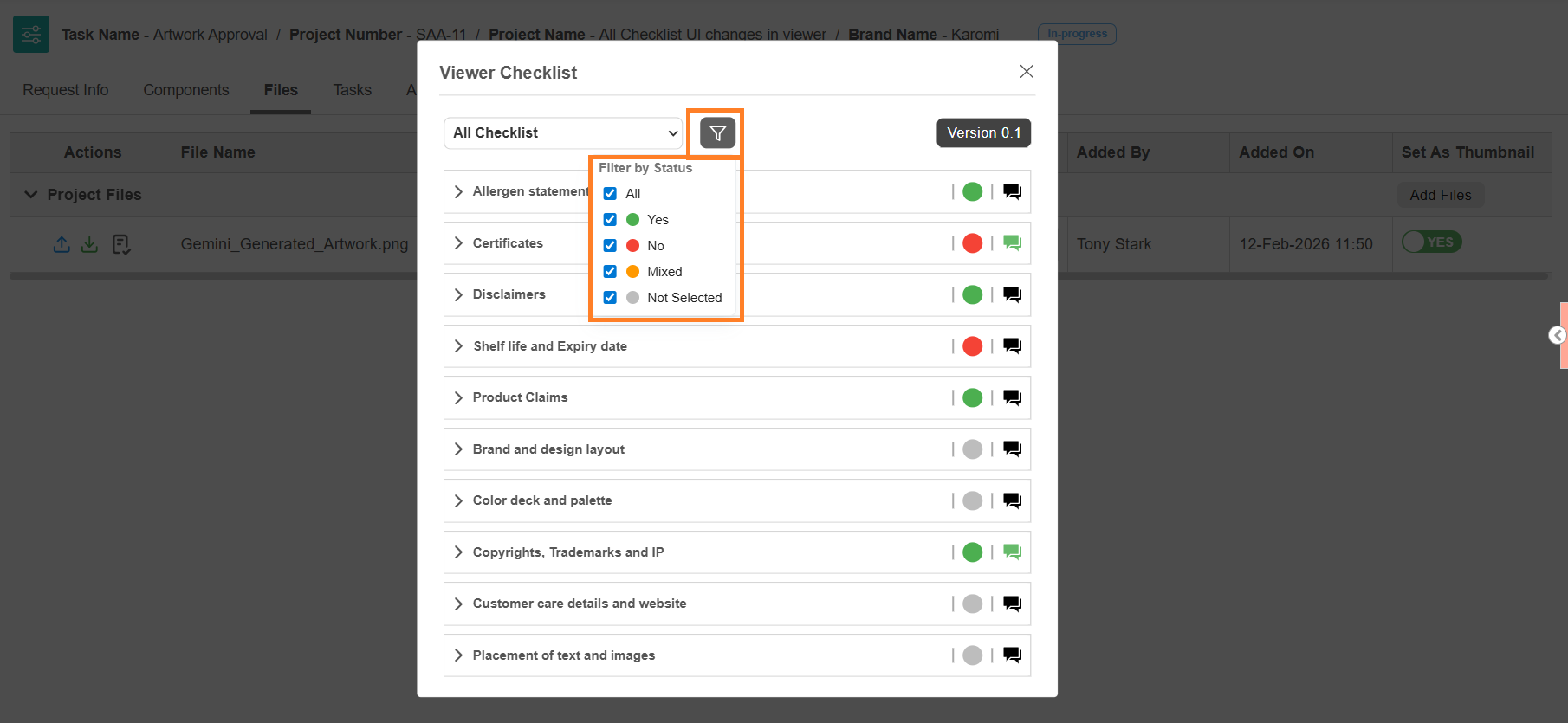 - The checklist panel displays all checklist items associated with the task and file. All actions (decision selection, comments, summary, filtering) work the same as in the Files tab.