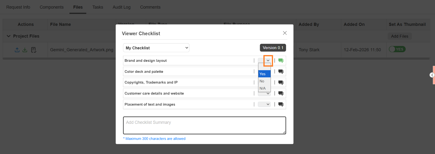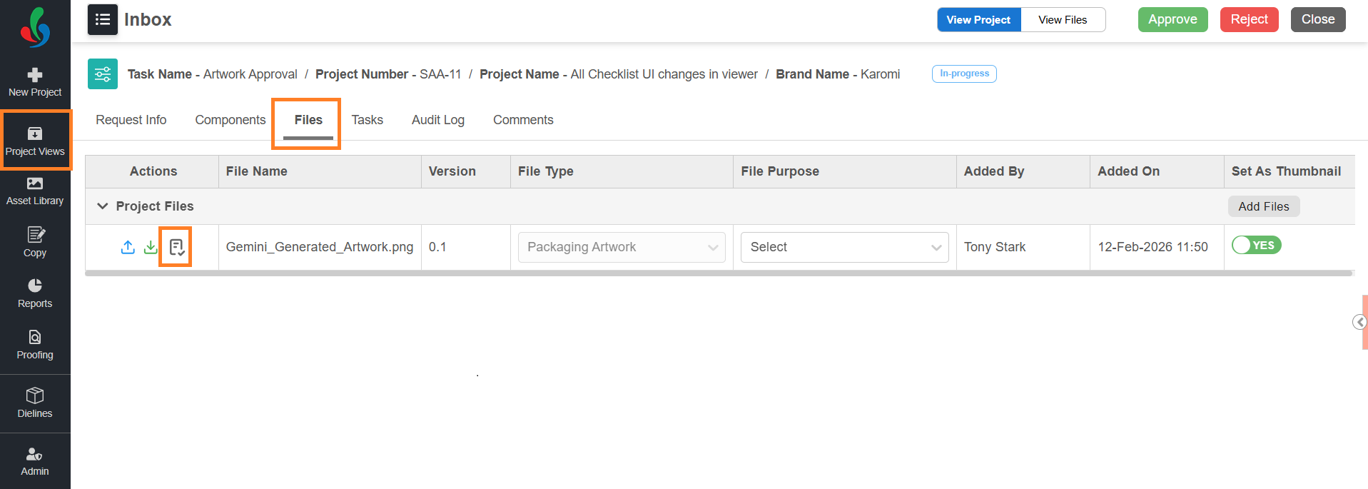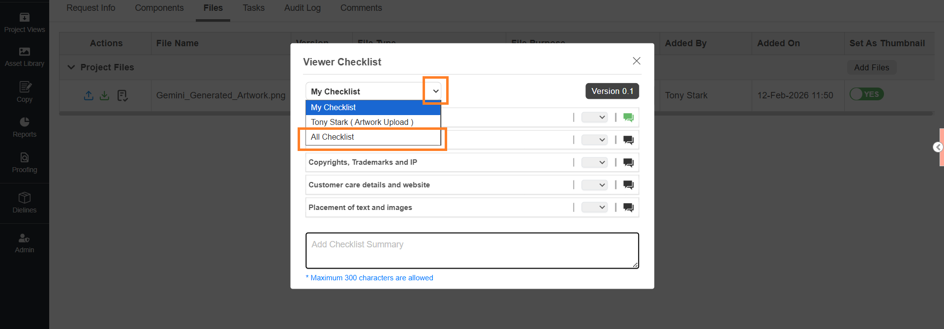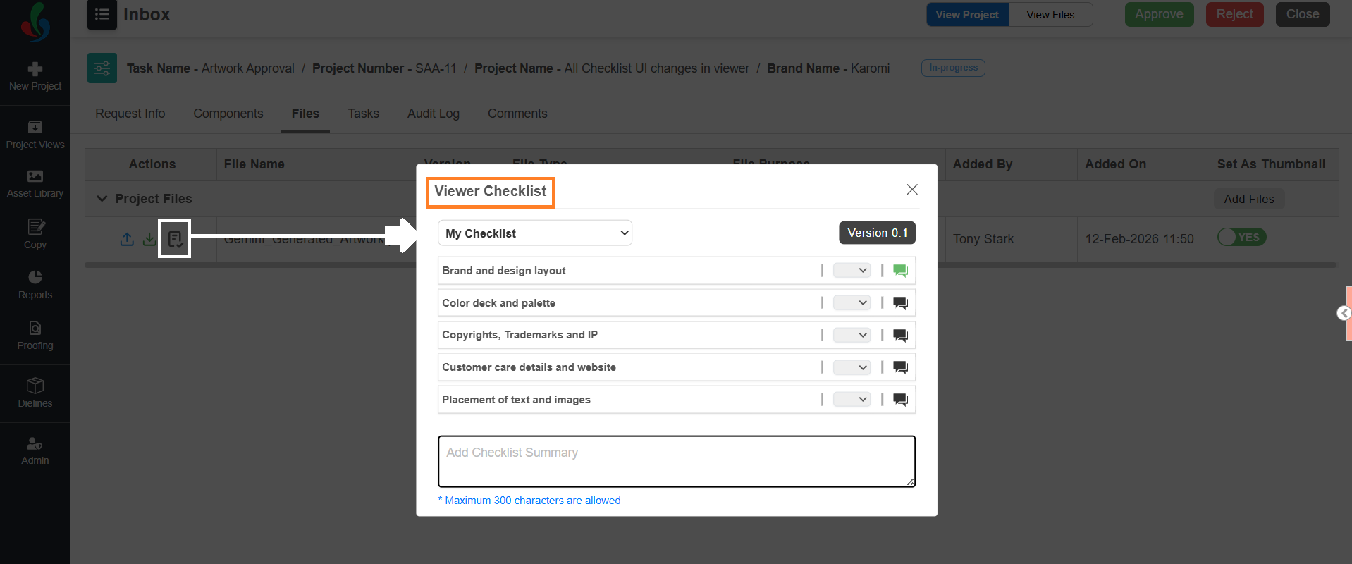 Note: In ManageArtworks, checklists are associated only with the file type, even though they are configured at the task level. If a checklist is configured for a task but the corresponding file type is not uploaded in that task, the checklist will not appear. π‘Tip: To avoid this limitation, configure the same checklist file type as a required file for the task. This ensures that users cannot submit the task unless the required file is uploaded. Once the file is uploaded, the checklist becomes available. |