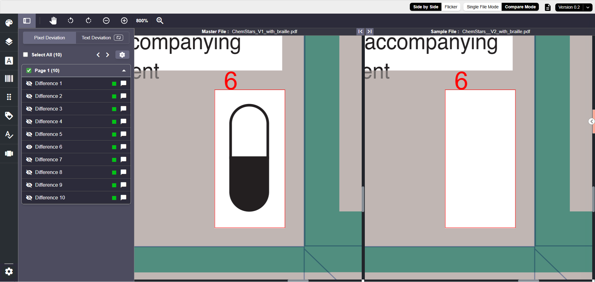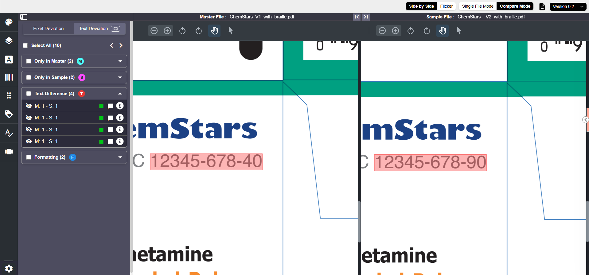 Even when the dieline is the same, if large blocks of content move to different panels, Pixel Compare will show many deviations. In such cases, Text Compare may be more useful.