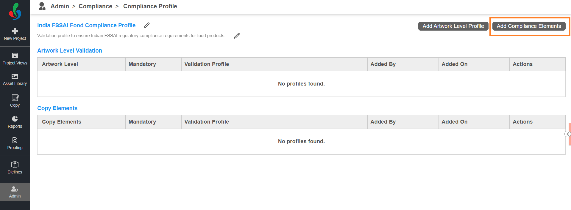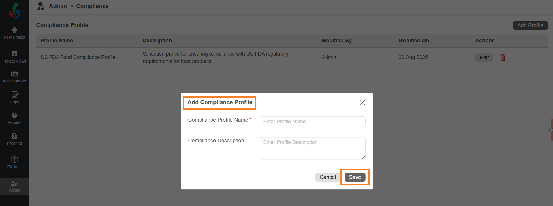 - Enter a name in Compliance Profile Name (for example, India FSSAI Food Compliance Profile).