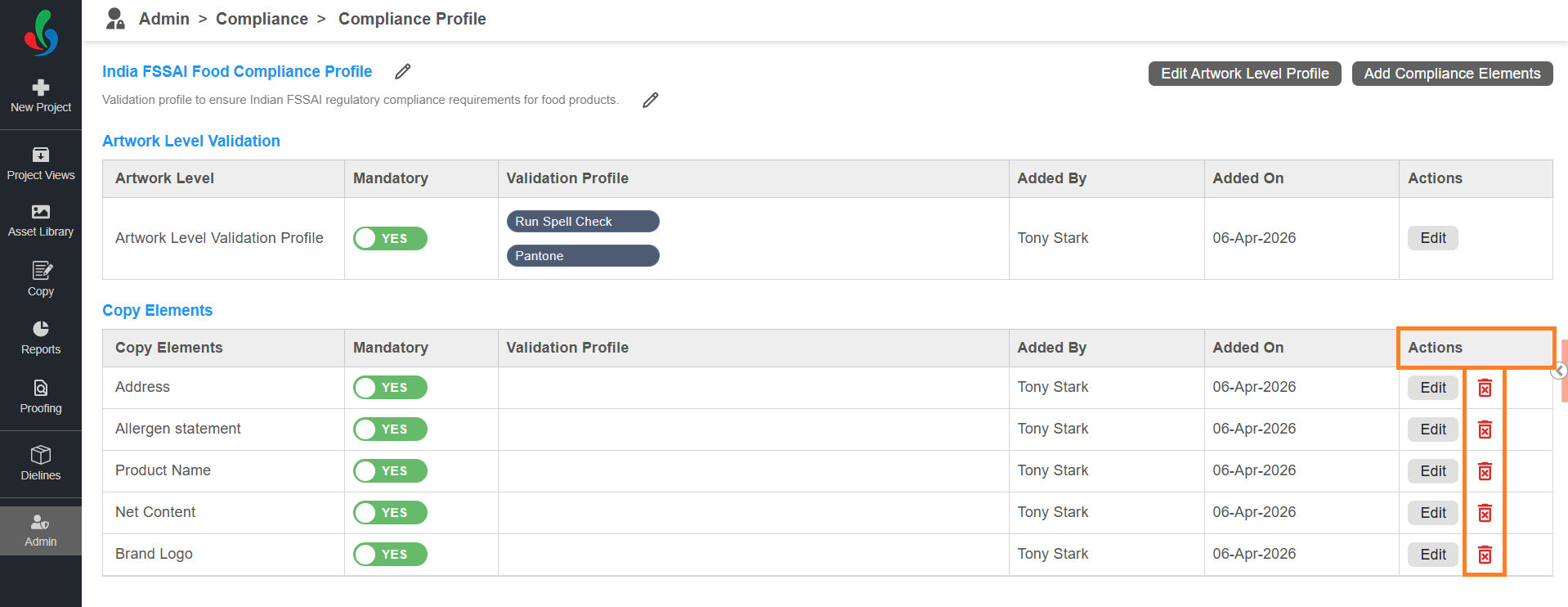 - To remove the added element, select the Delete icon in the Actions column for the elemnt.