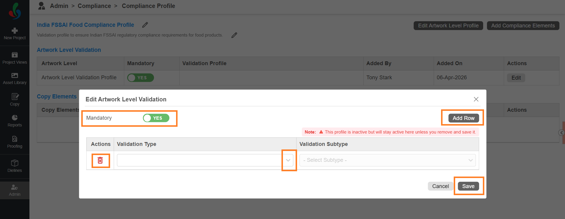 Note: When enabled, users cannot exclude this validation during compliance checks. - Select Add Row.