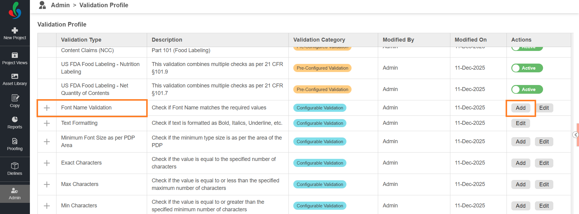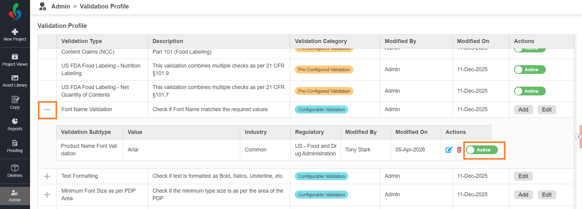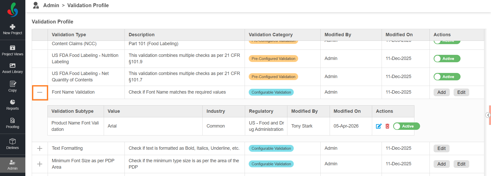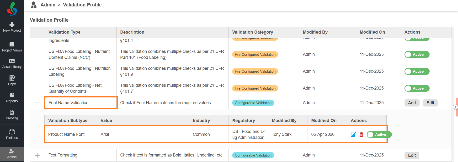 The Validation Profile allows you to create and manage validation rules used in compliance checks within ManageArtworks. These rules help ensure that all elements in the artwork—such as text, labels, images, and formatting—follow the required regulatory standards and quality guidelines.