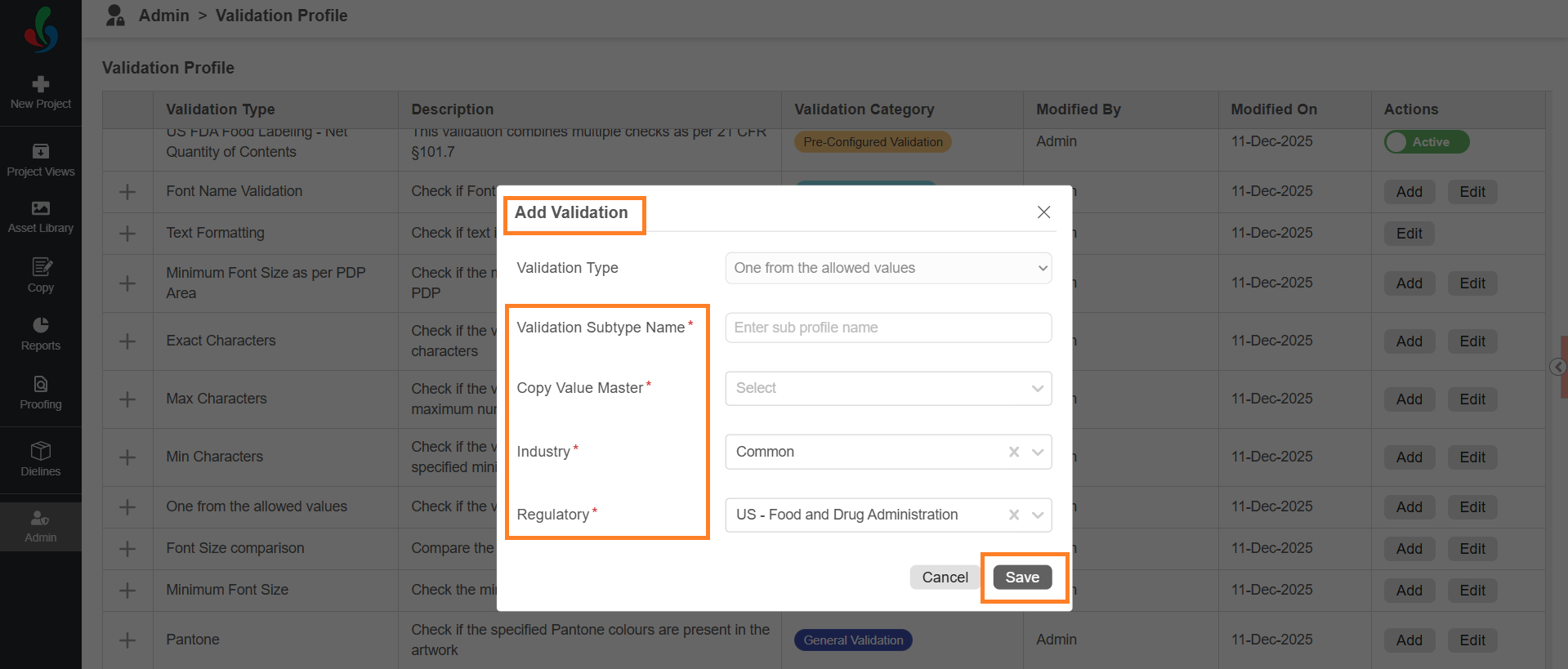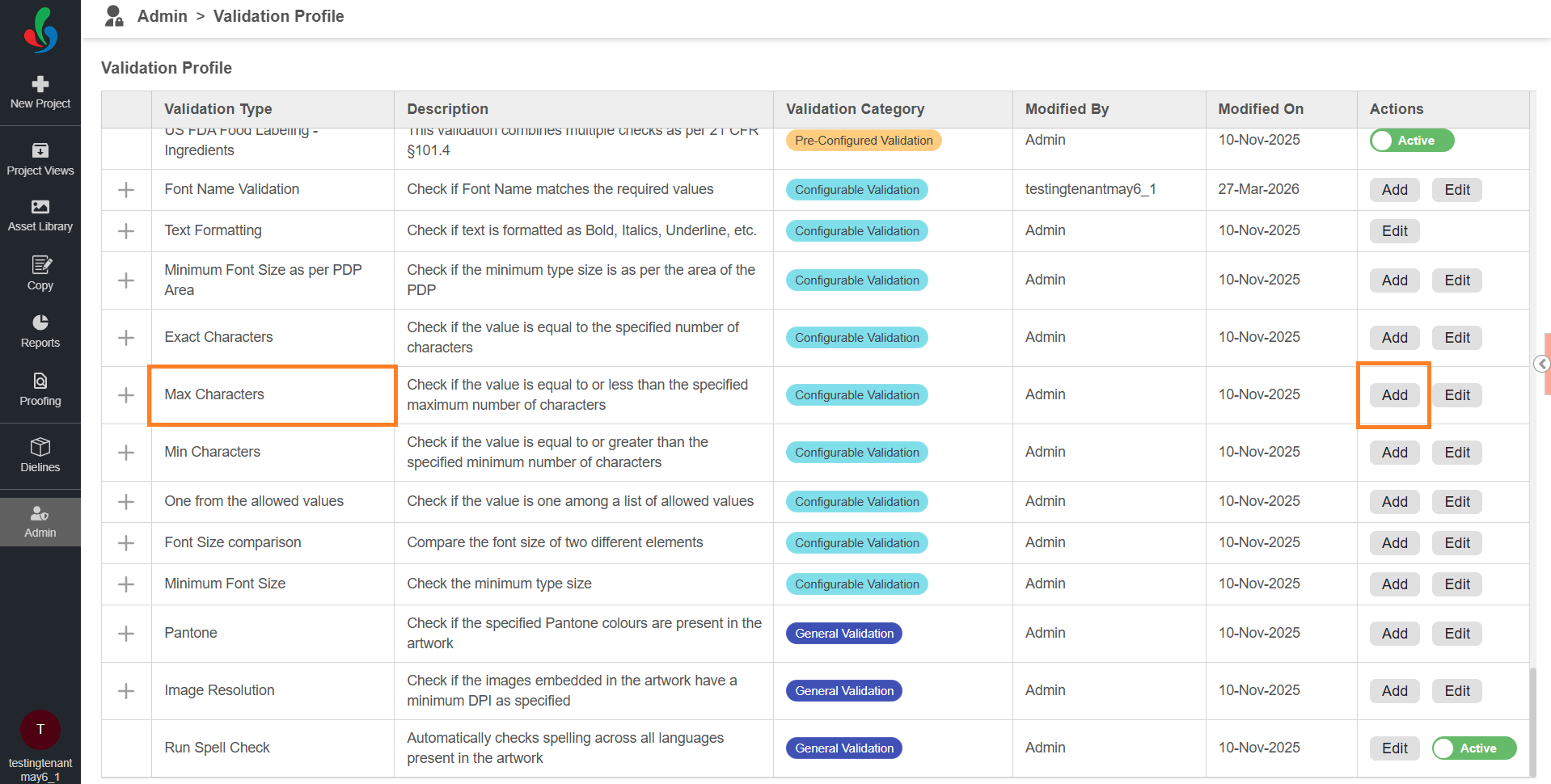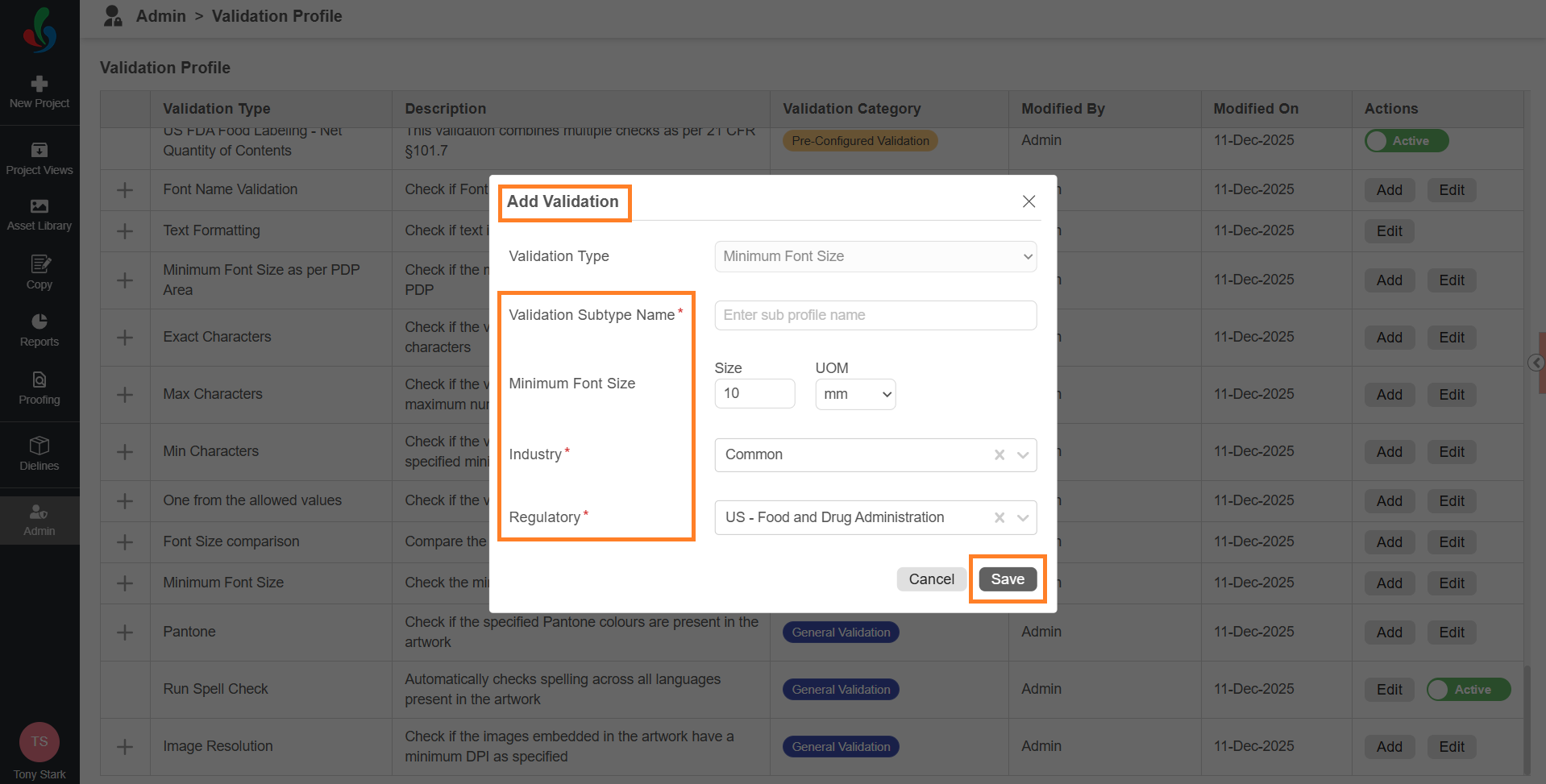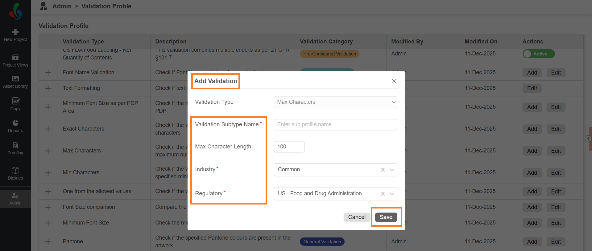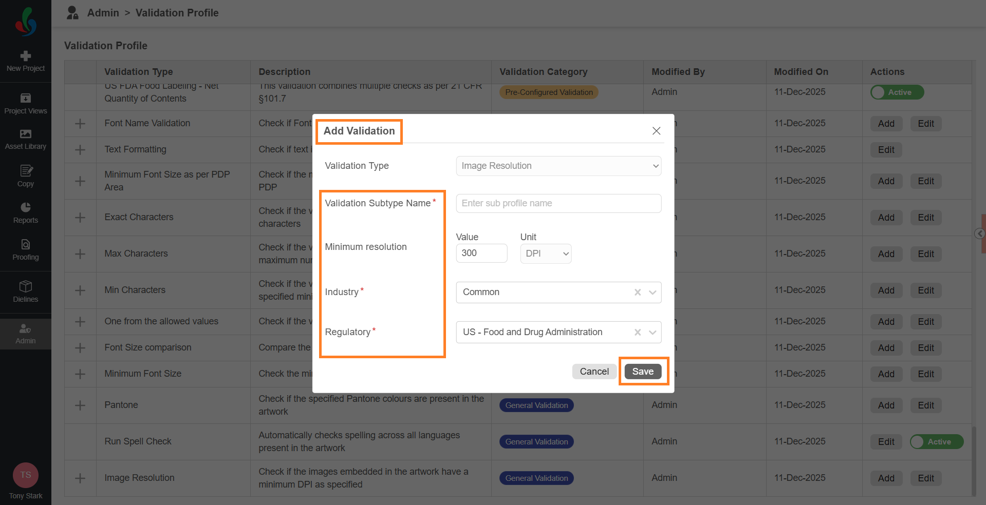 The Validation Profile allows you to create and manage validation rules used in compliance checks within ManageArtworks. These rules help ensure that all elements in the artwork—such as text, labels, images, and formatting—follow the required regulatory standards and quality guidelines.