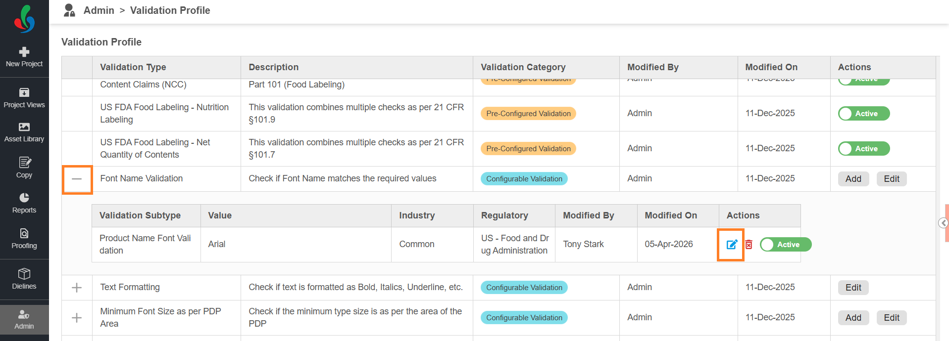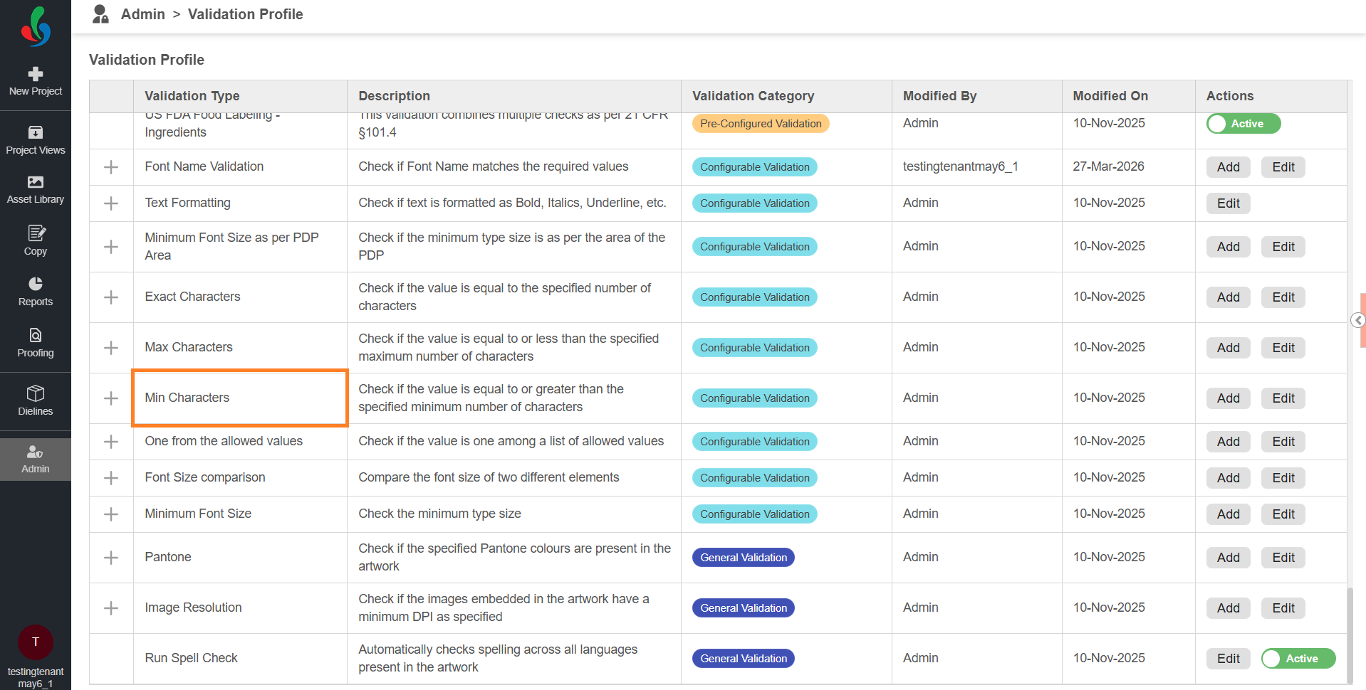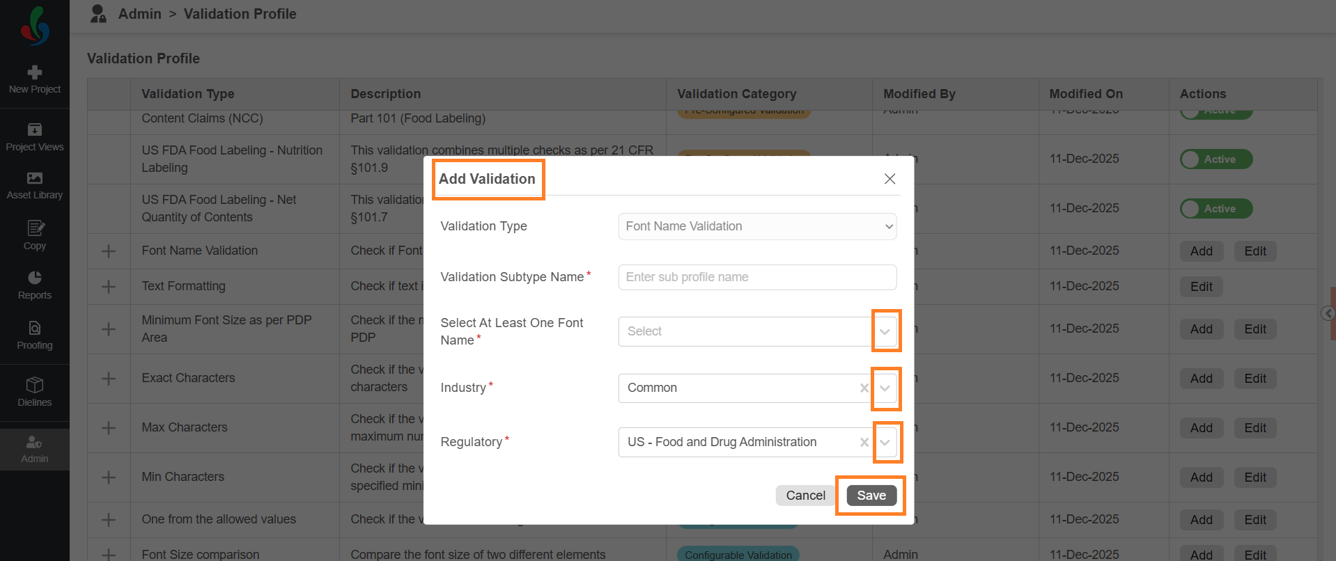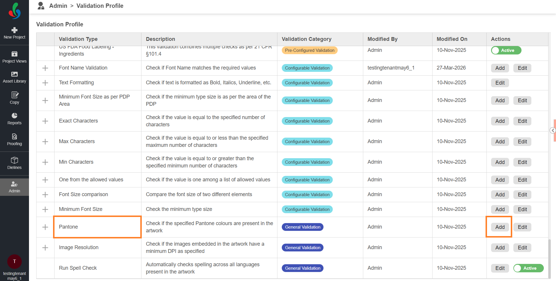 The Validation Profile allows you to create and manage validation rules used in compliance checks within ManageArtworks. These rules help ensure that all elements in the artwork—such as text, labels, images, and formatting—follow the required regulatory standards and quality guidelines.