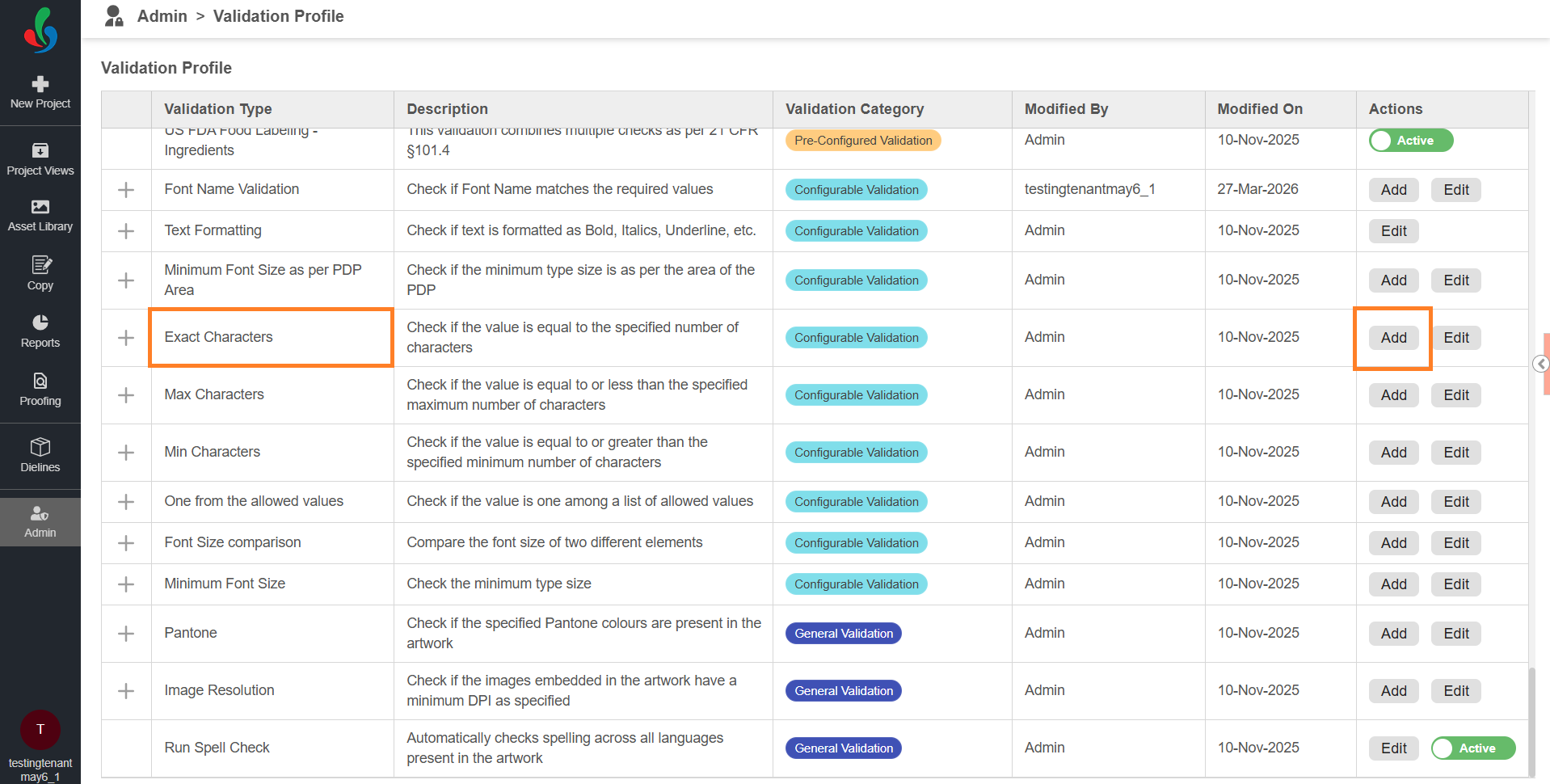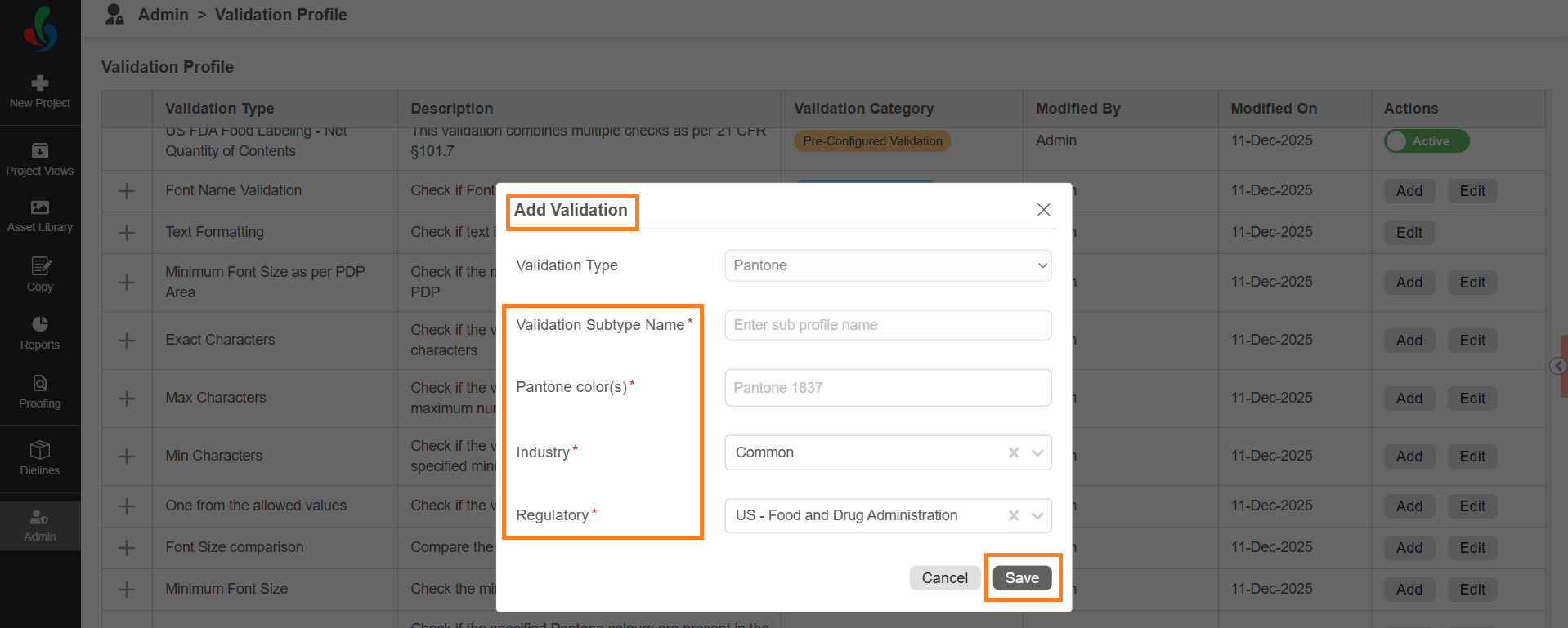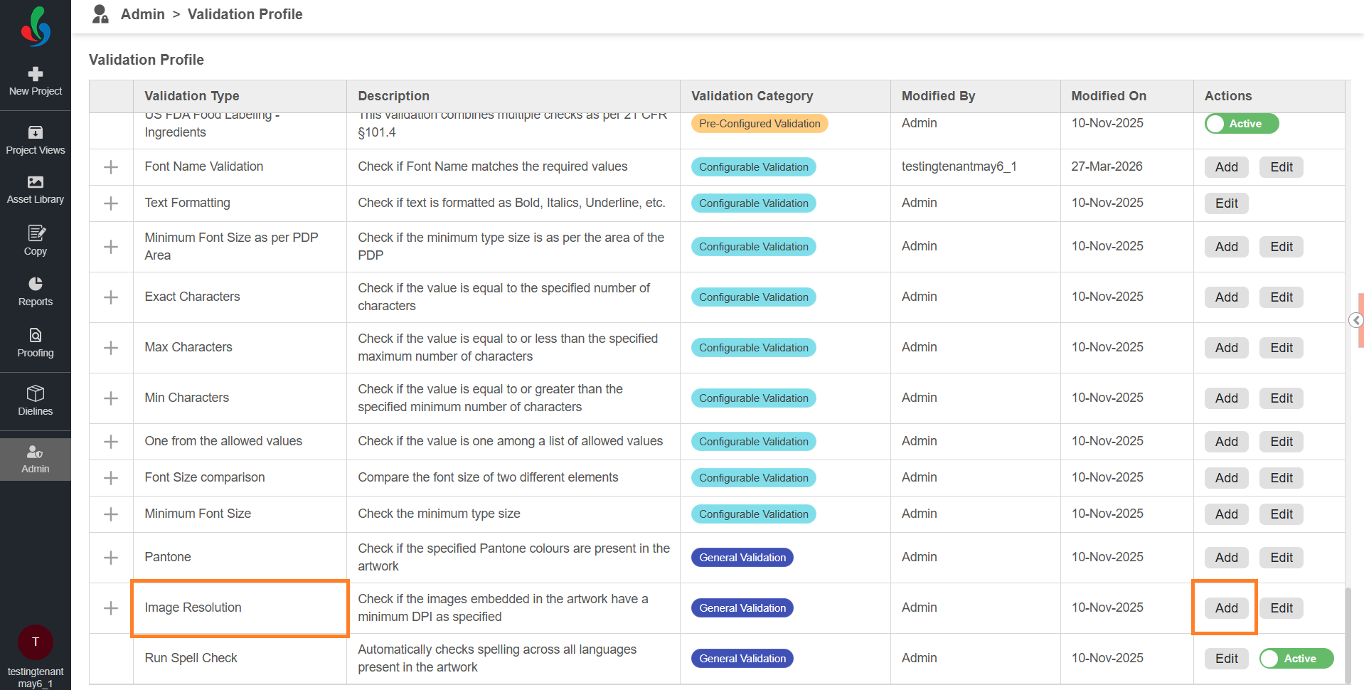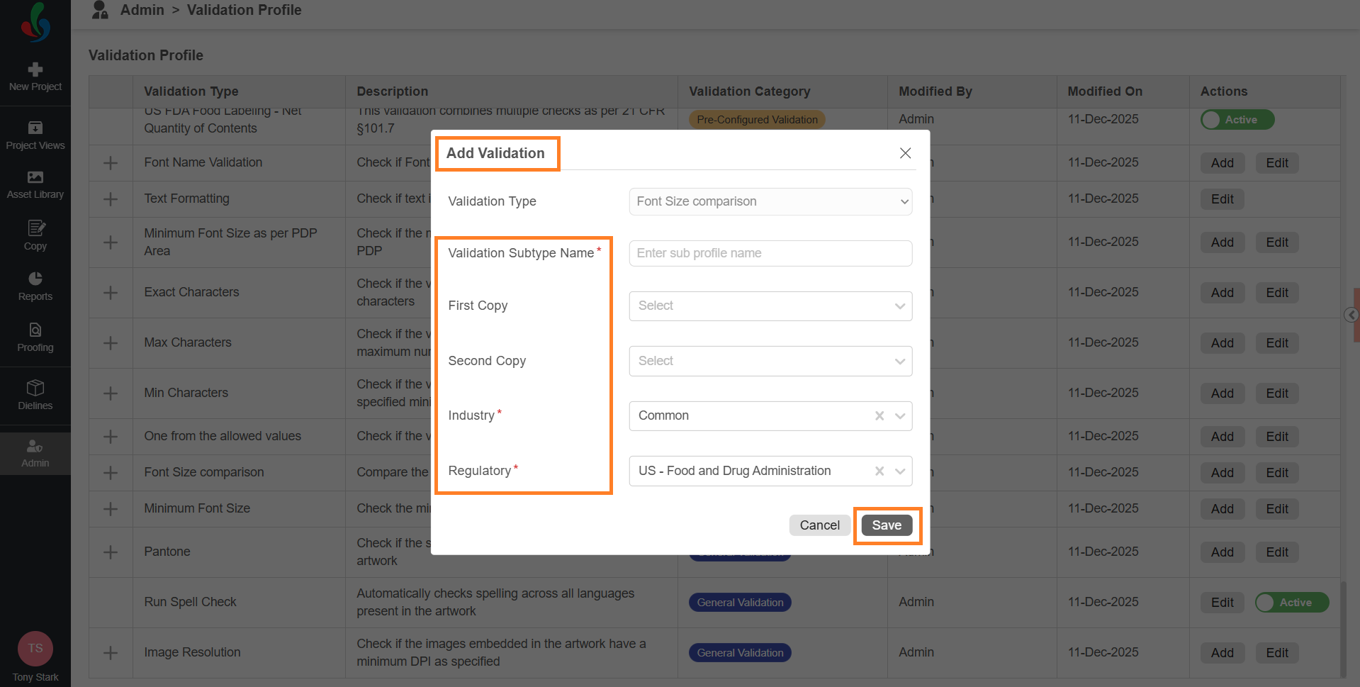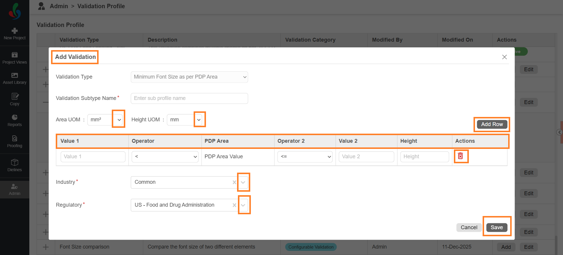 The Validation Profile allows you to create and manage validation rules used in compliance checks within ManageArtworks. These rules help ensure that all elements in the artwork—such as text, labels, images, and formatting—follow the required regulatory standards and quality guidelines.