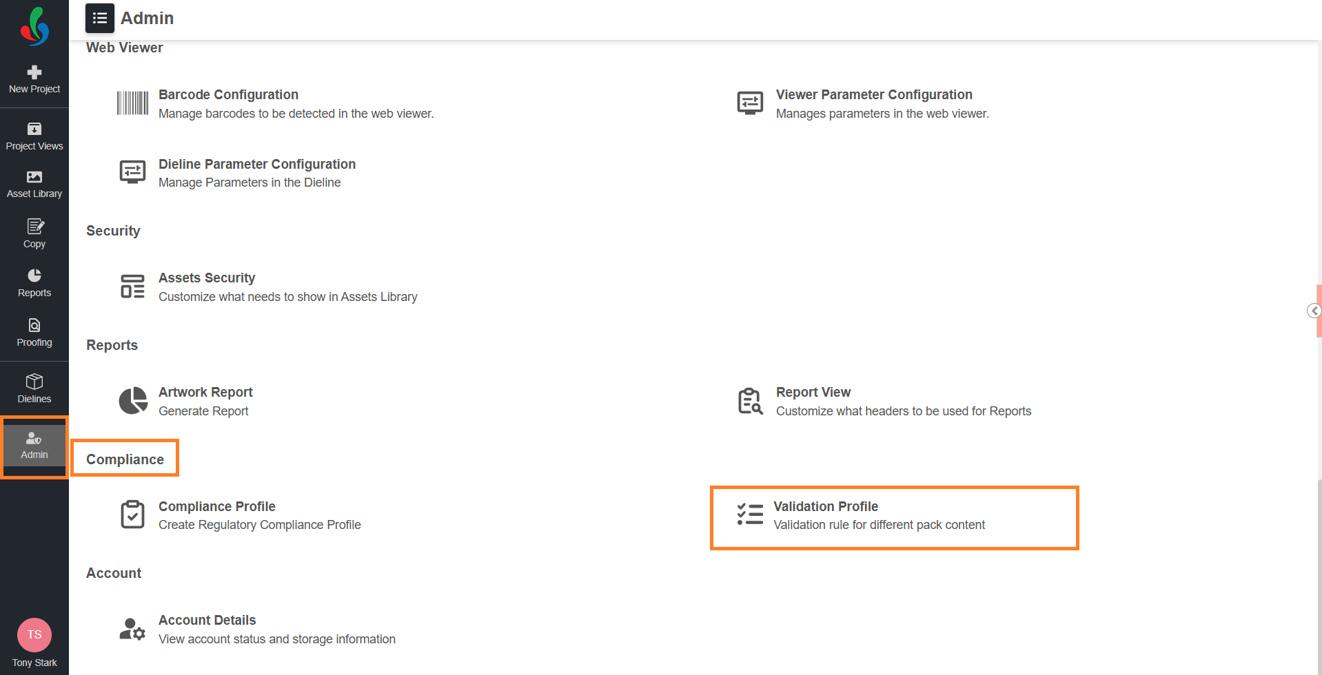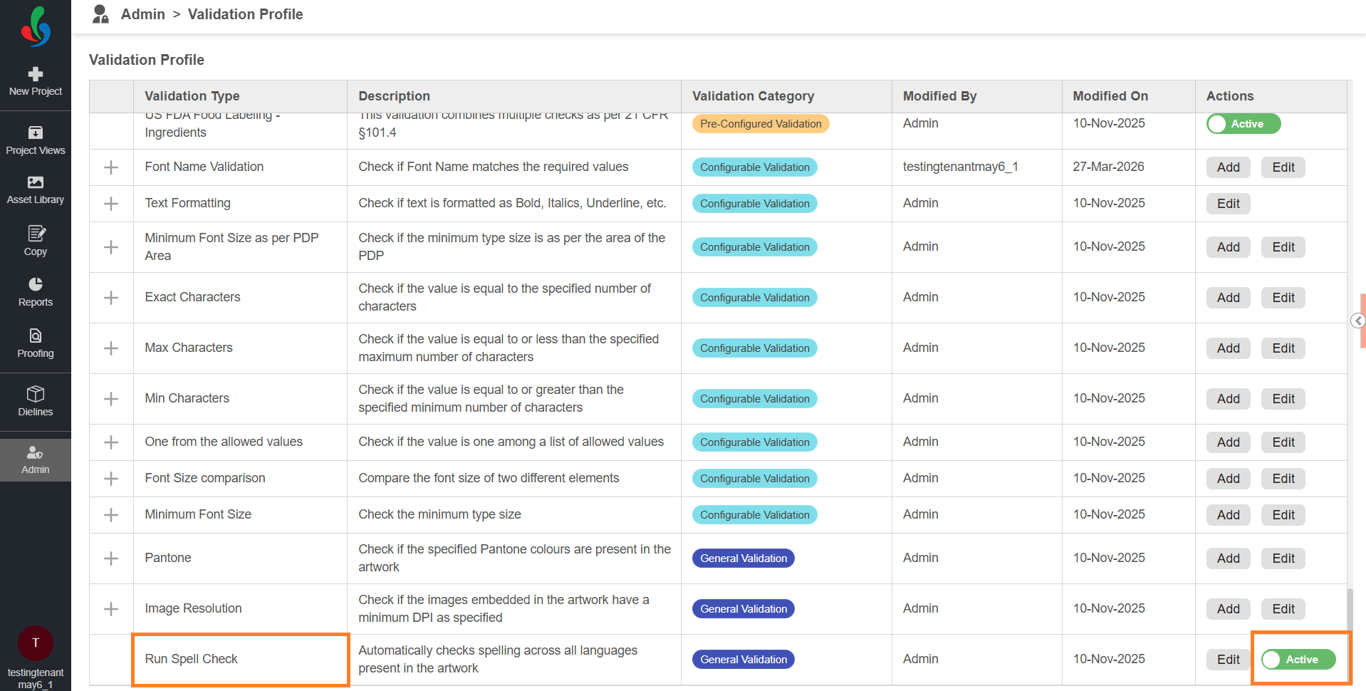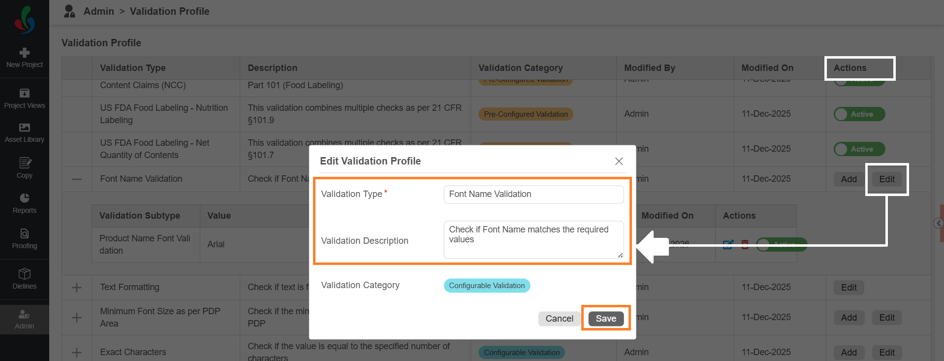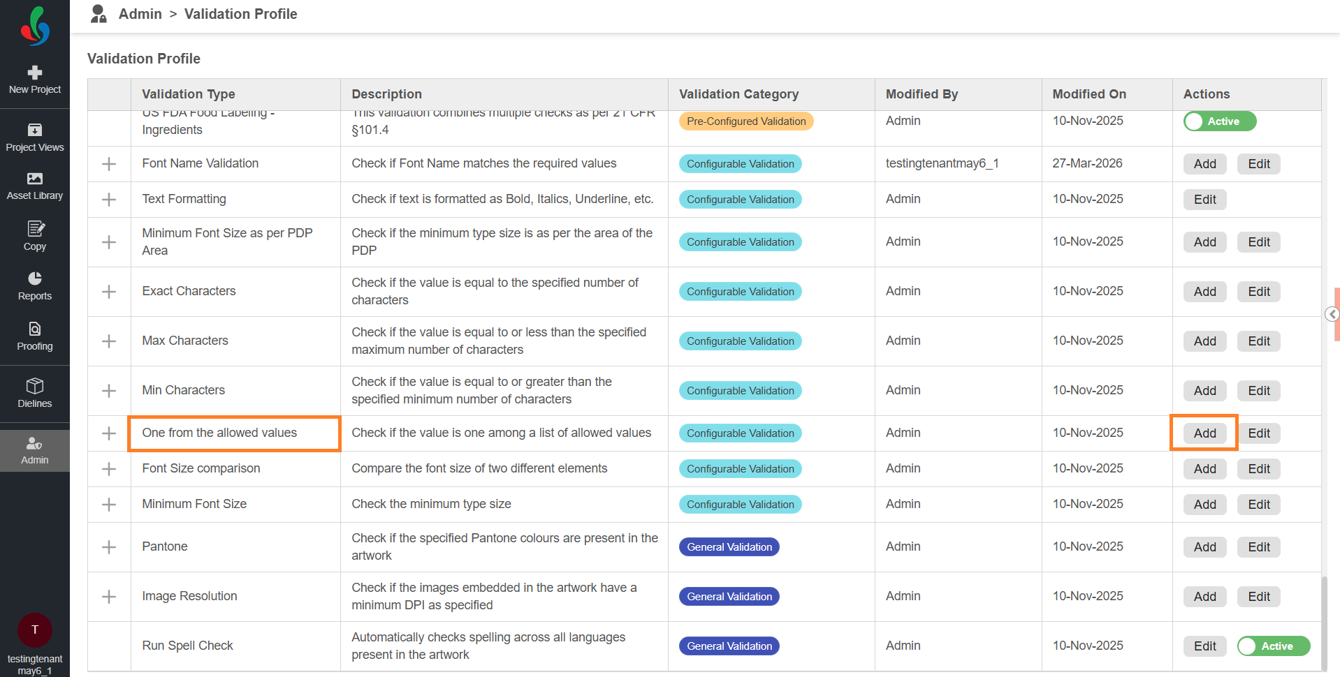 The Validation Profile allows you to create and manage validation rules used in compliance checks within ManageArtworks. These rules help ensure that all elements in the artwork—such as text, labels, images, and formatting—follow the required regulatory standards and quality guidelines.