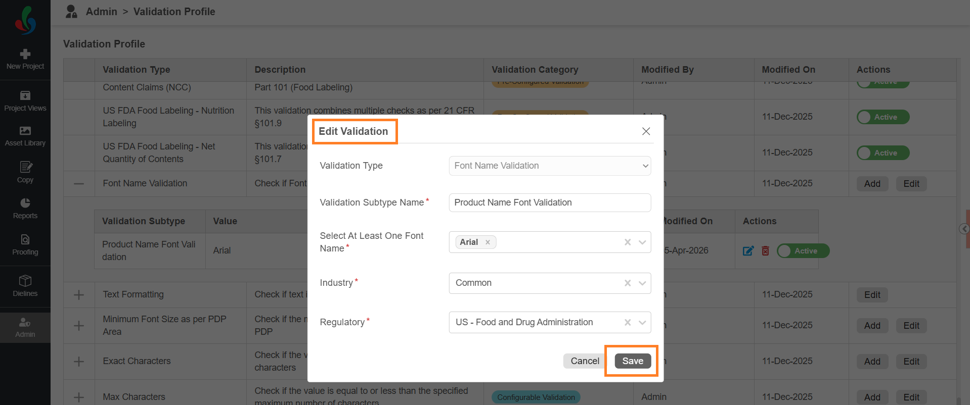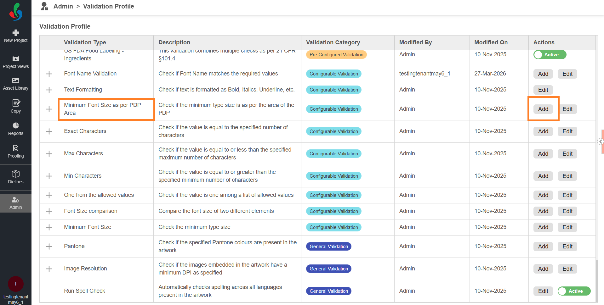 Define the required validation rules in the Validation Profile.- Each validation type (such as Font name Validation, Pantone) is configured here with the necessary parameters.