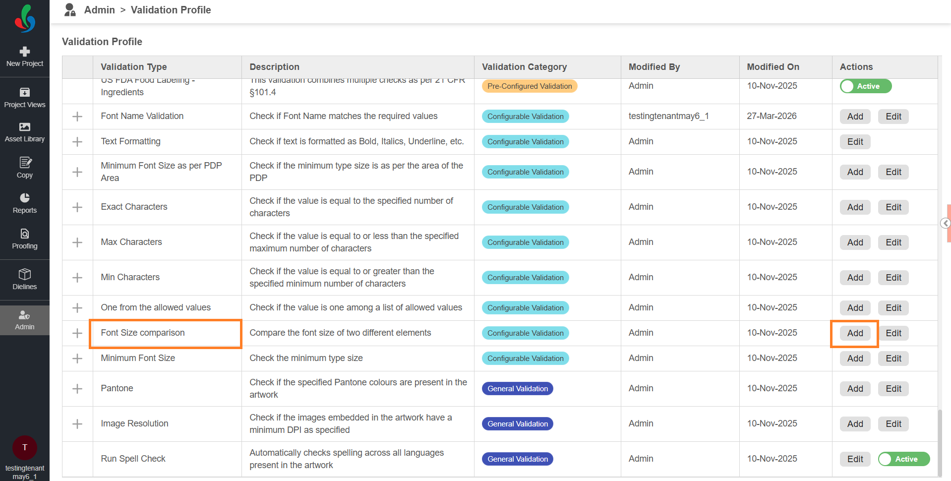 - On the Validation Profile page, locate Font Size Comparison profile.