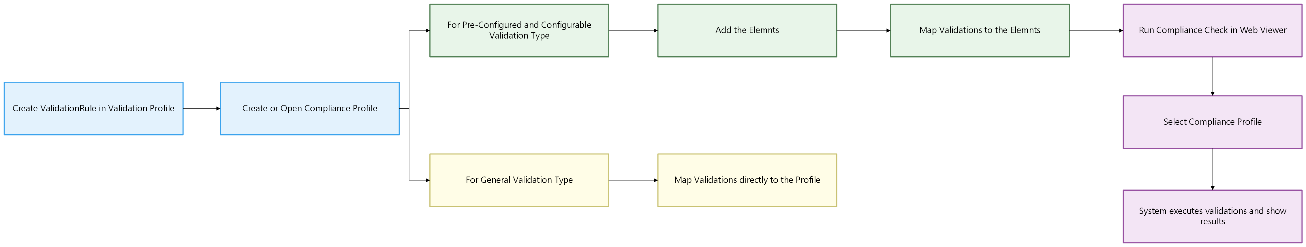 Validation Profiles define the rules, but they are not directly used during compliance checks. As mentioned earlier, validation rules must be mapped within a compliance profile before they can be executed. The following flowchart explains how this works.