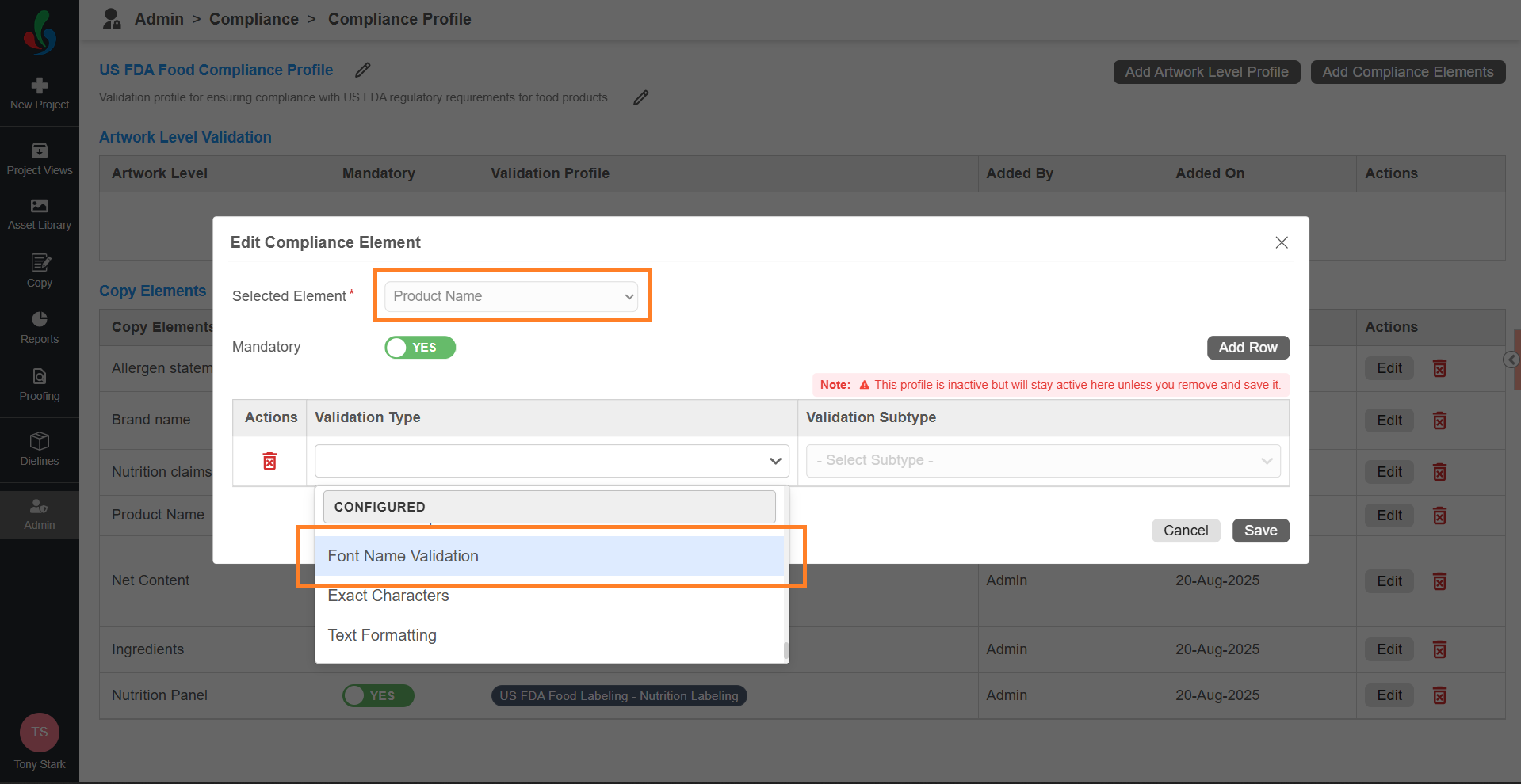 Note: Each validation is applied to a specific element within a compliance profile. To execute validations during compliance checks, ensure that they are properly mapped to the respective elements. ManageArtworks provides pre-configured validation profiles and compliance profiles with relevant elements and validation rules already mapped. You can use these compliance profiles directly or modify them as required. |