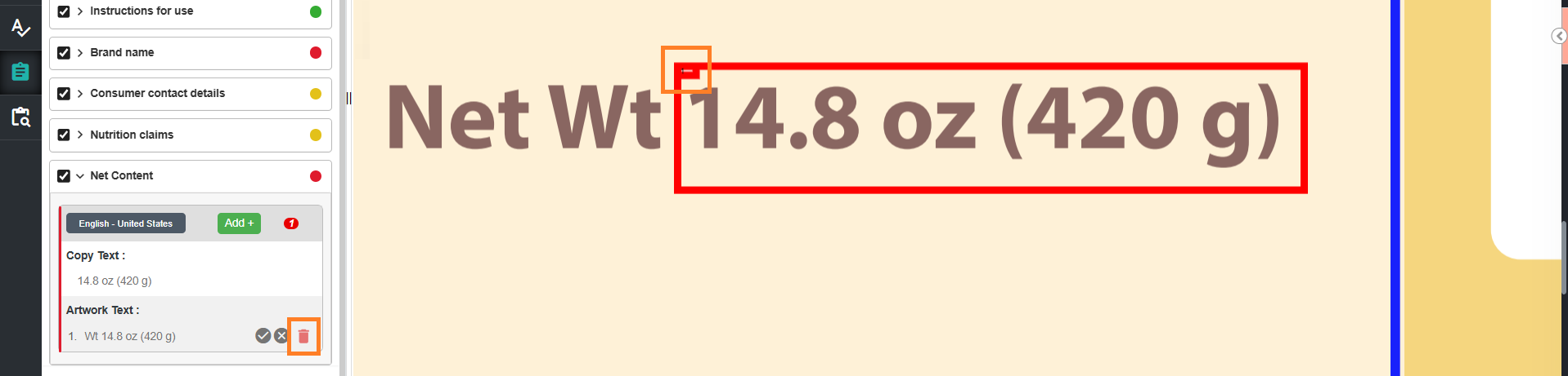 - To remove the incorrect detected artwork text occurrence, select the delete icon associated with it.