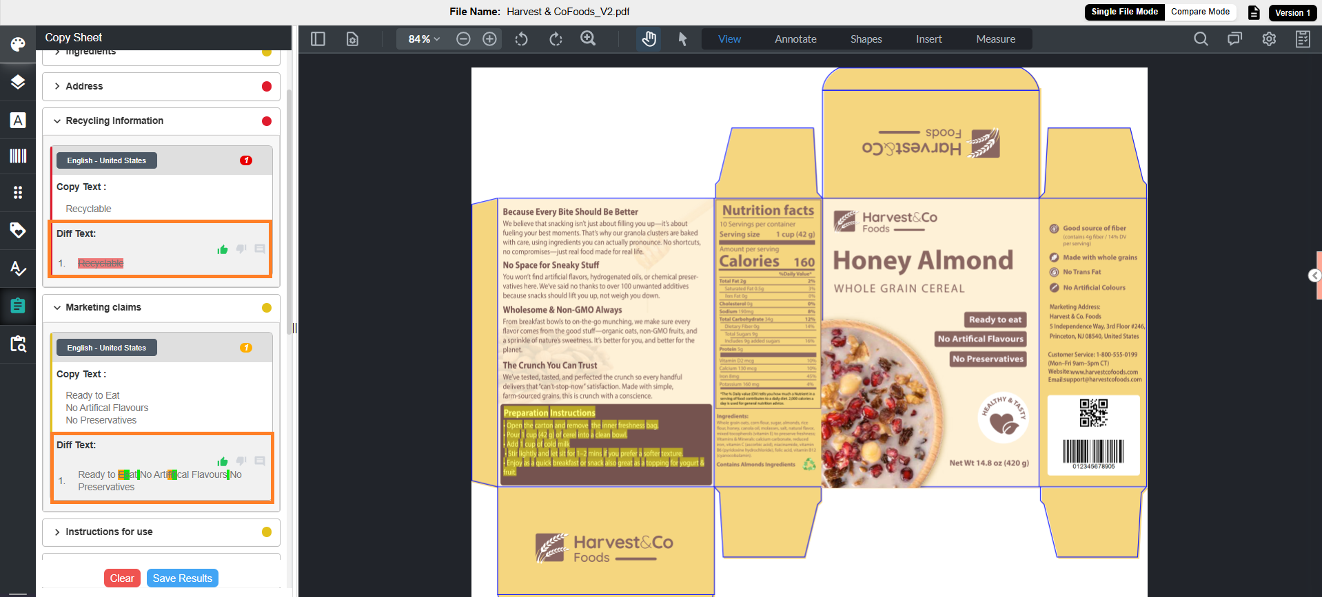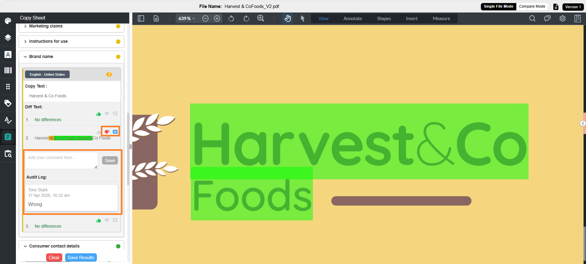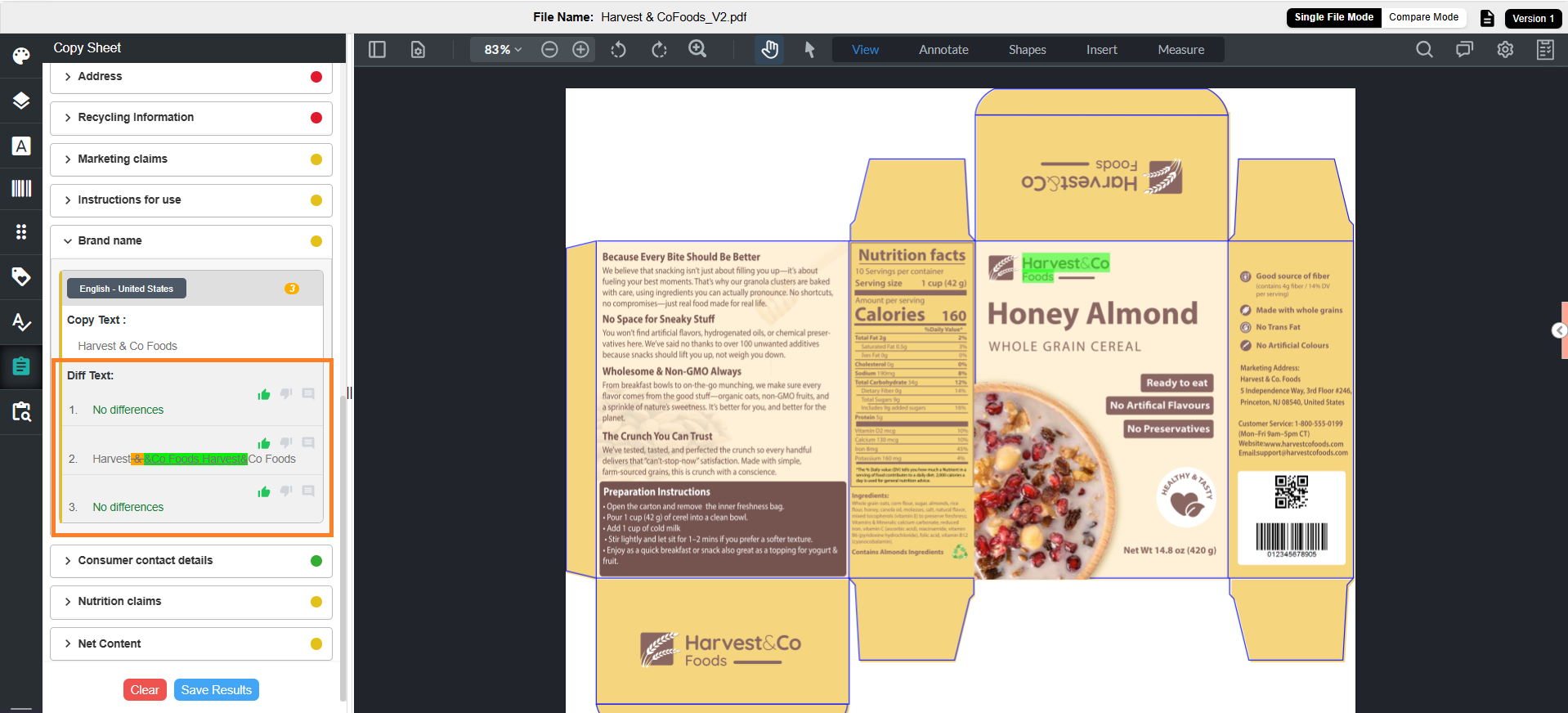 - Diff Text – Displays the comparison between copy text and artwork text with color-coded indicators