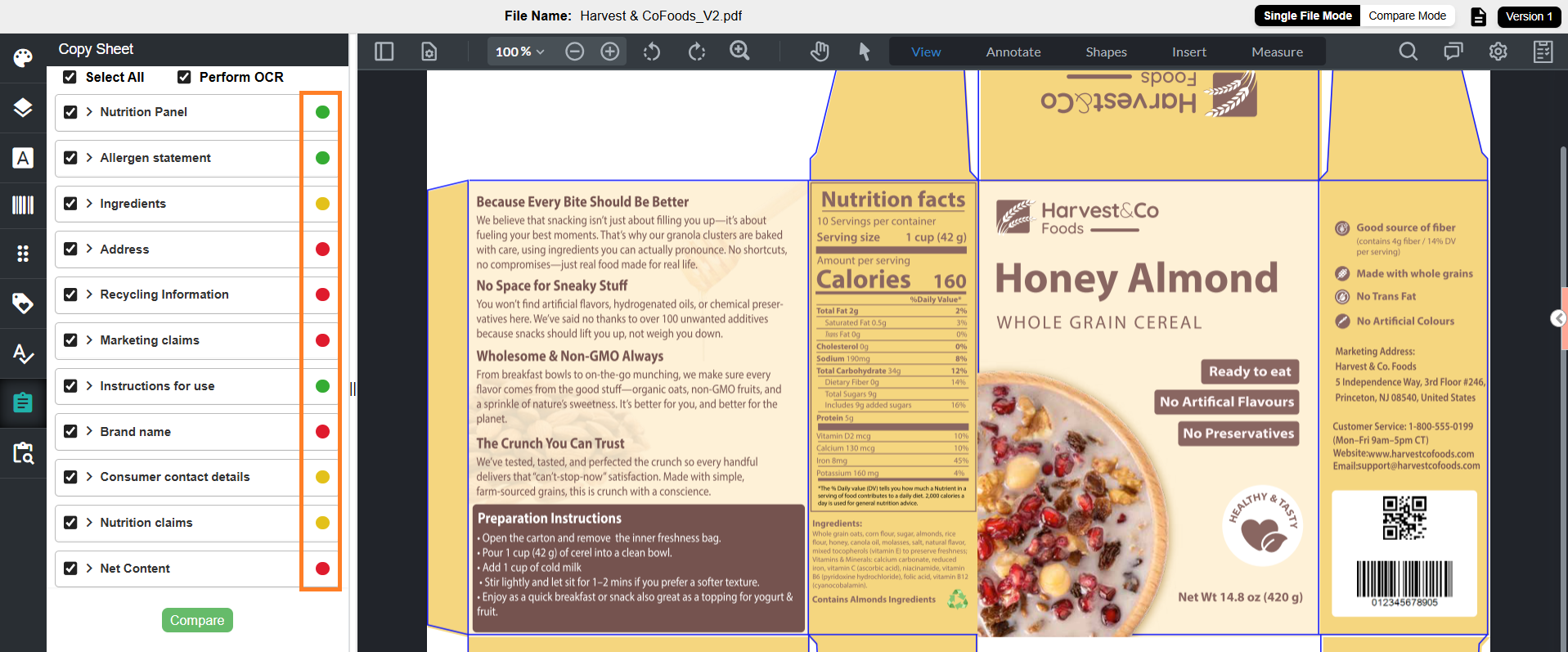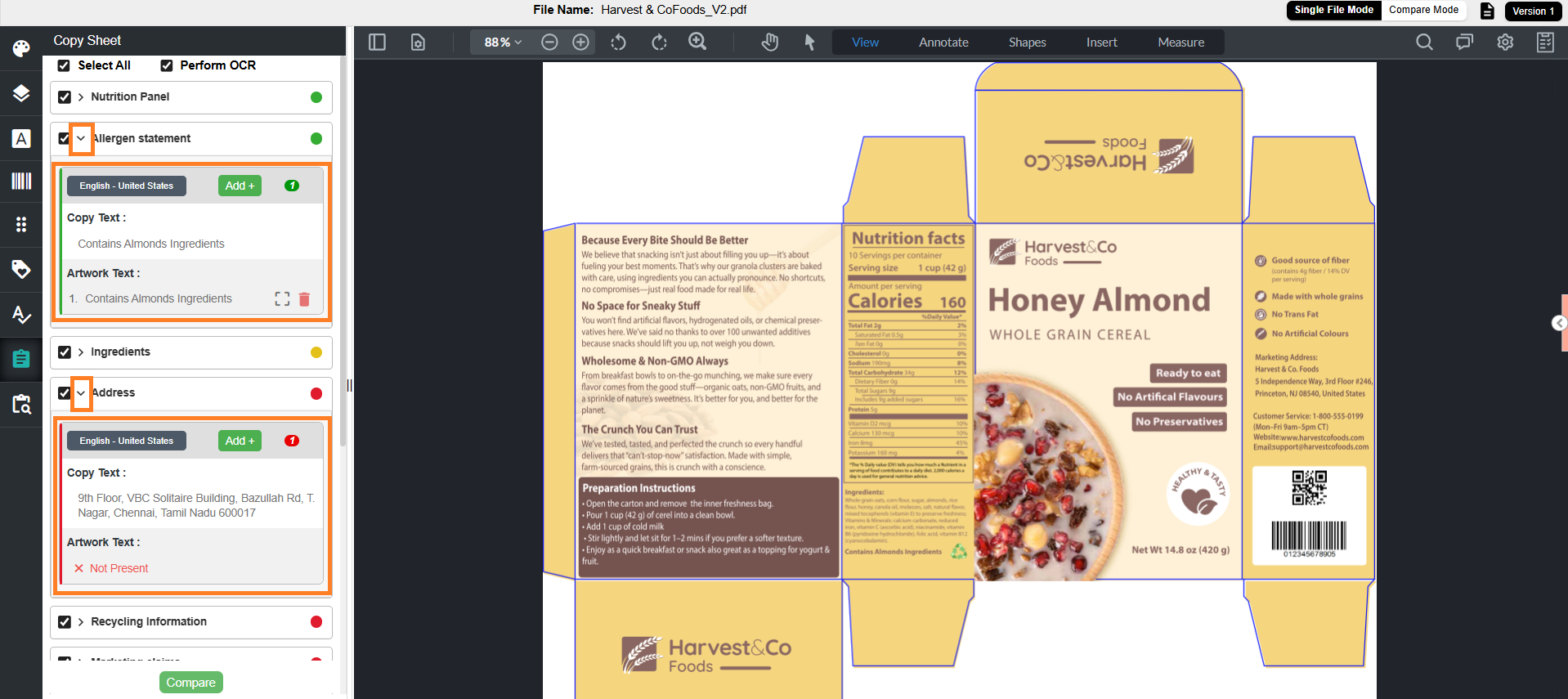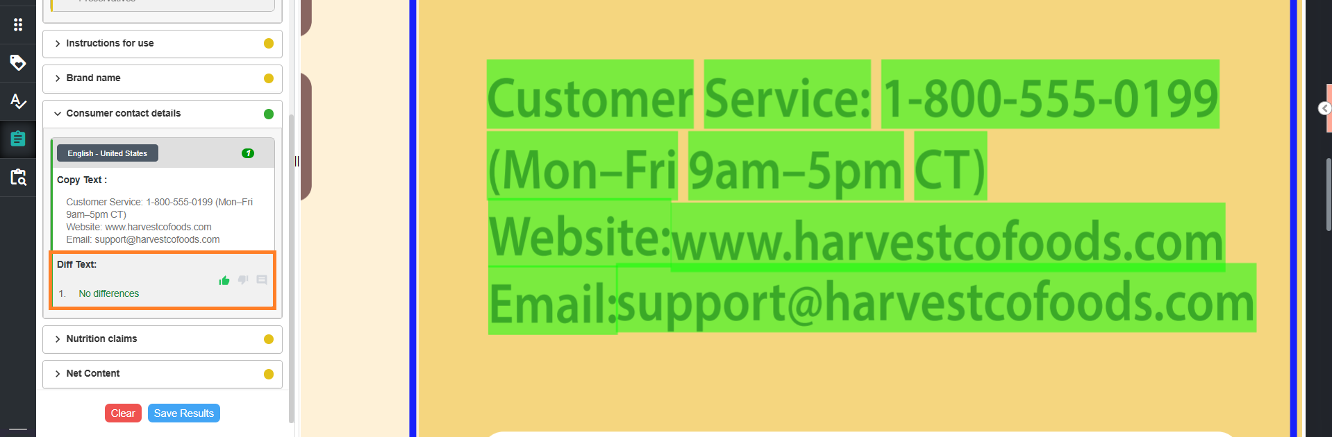 - Diff Text – Displays the comparison between copy text and artwork text with color-coded indicators