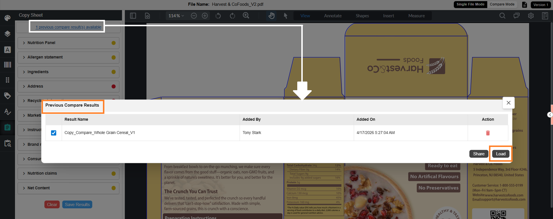 “X previous compare result(s) available” - Select the link to view saved comparison results.