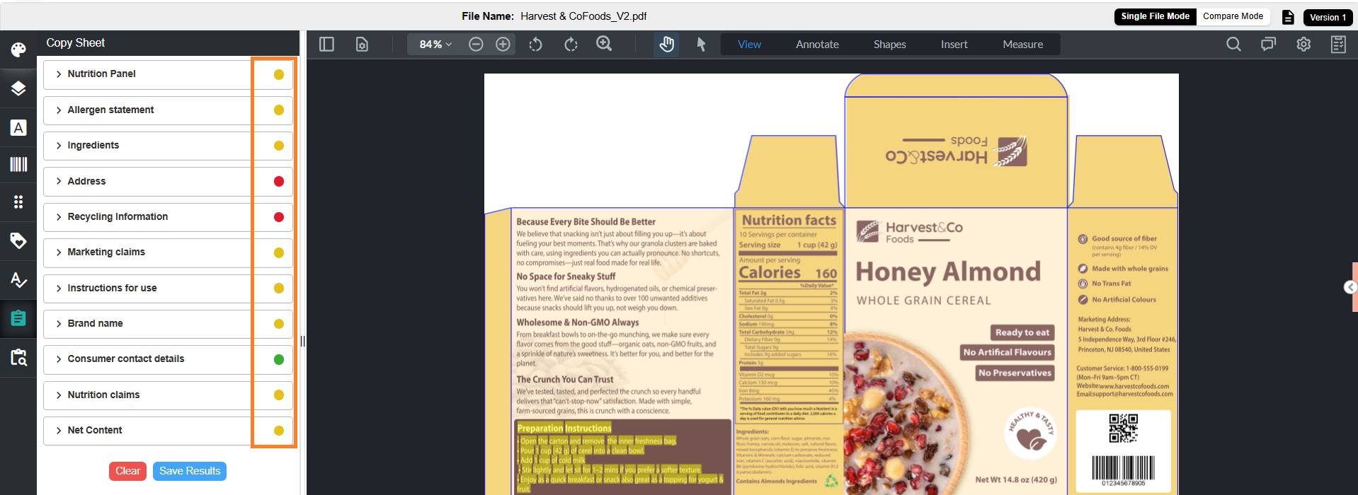 - Orange – Some artwork text occurrences match the copy text, while others have differences.