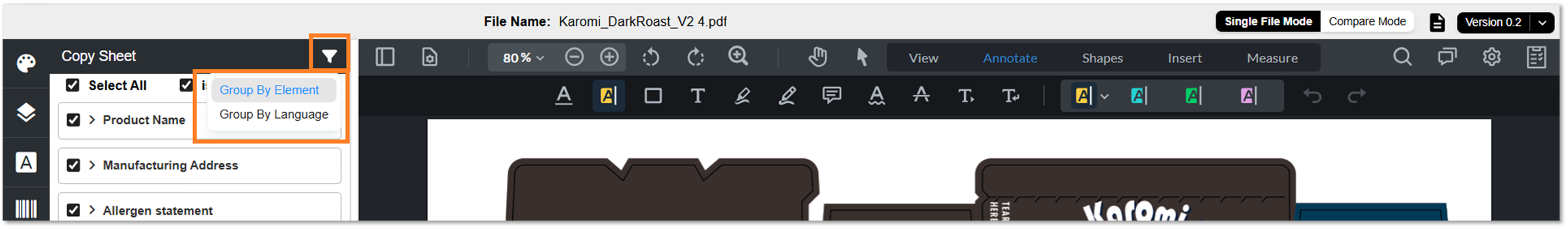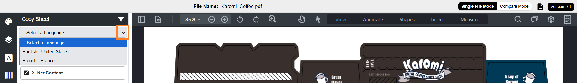 Note: If no language is selected, copy elements are not filtered by language and continue to follow the default grouping behavior. - Only copy elements associated with the selected language are displayed in the Copy Sheet panel.