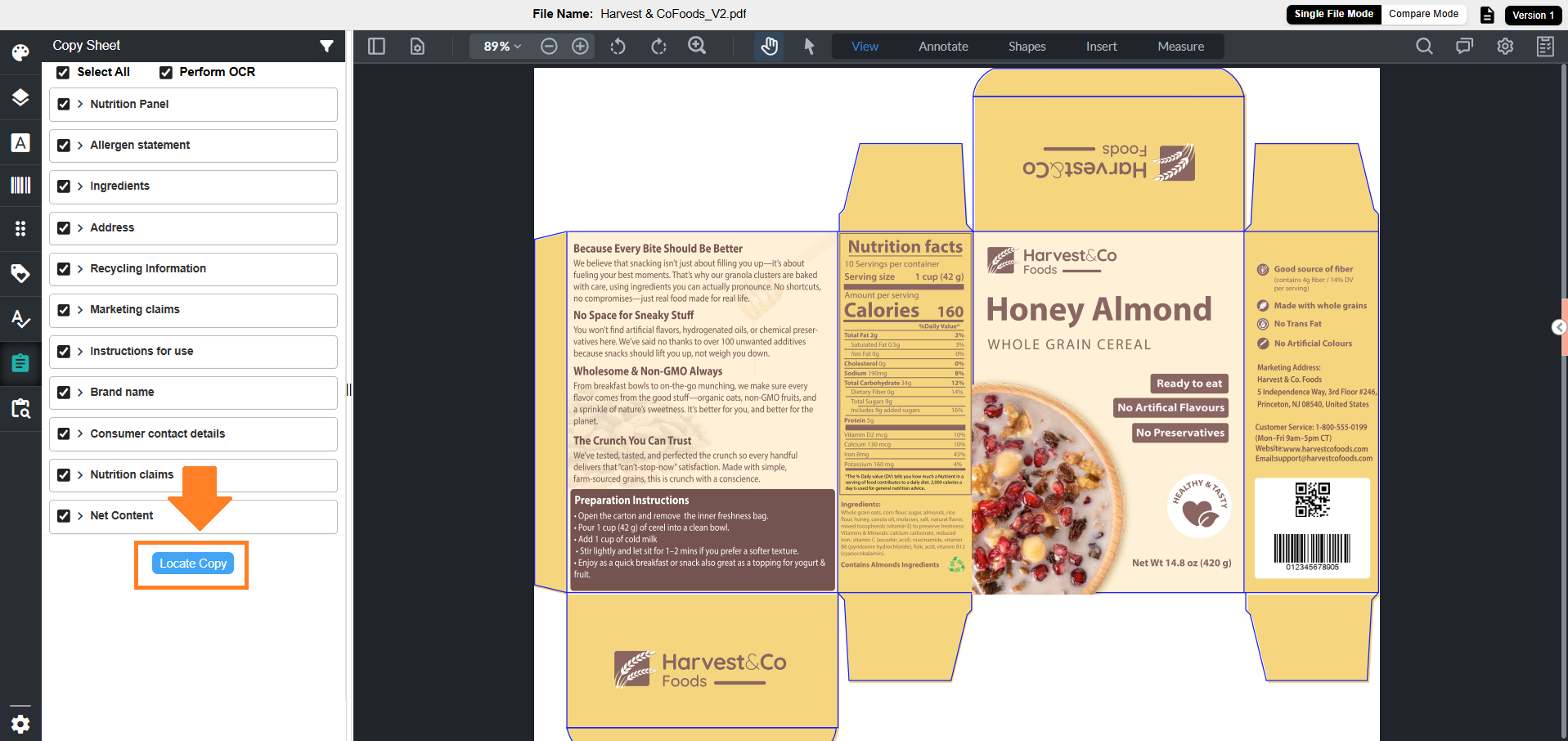 After selecting Locate Copy, the system analyzes the artwork and displays the identified copy locations in the Copy Sheet panel.