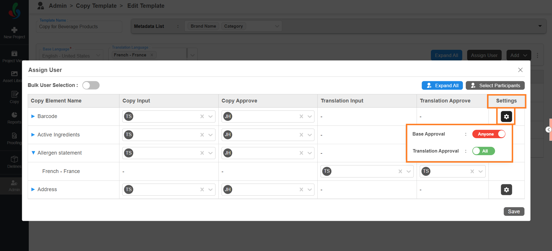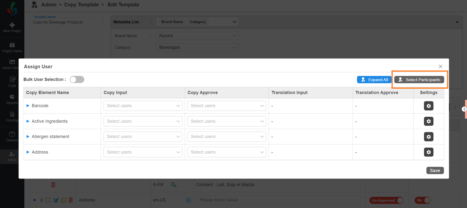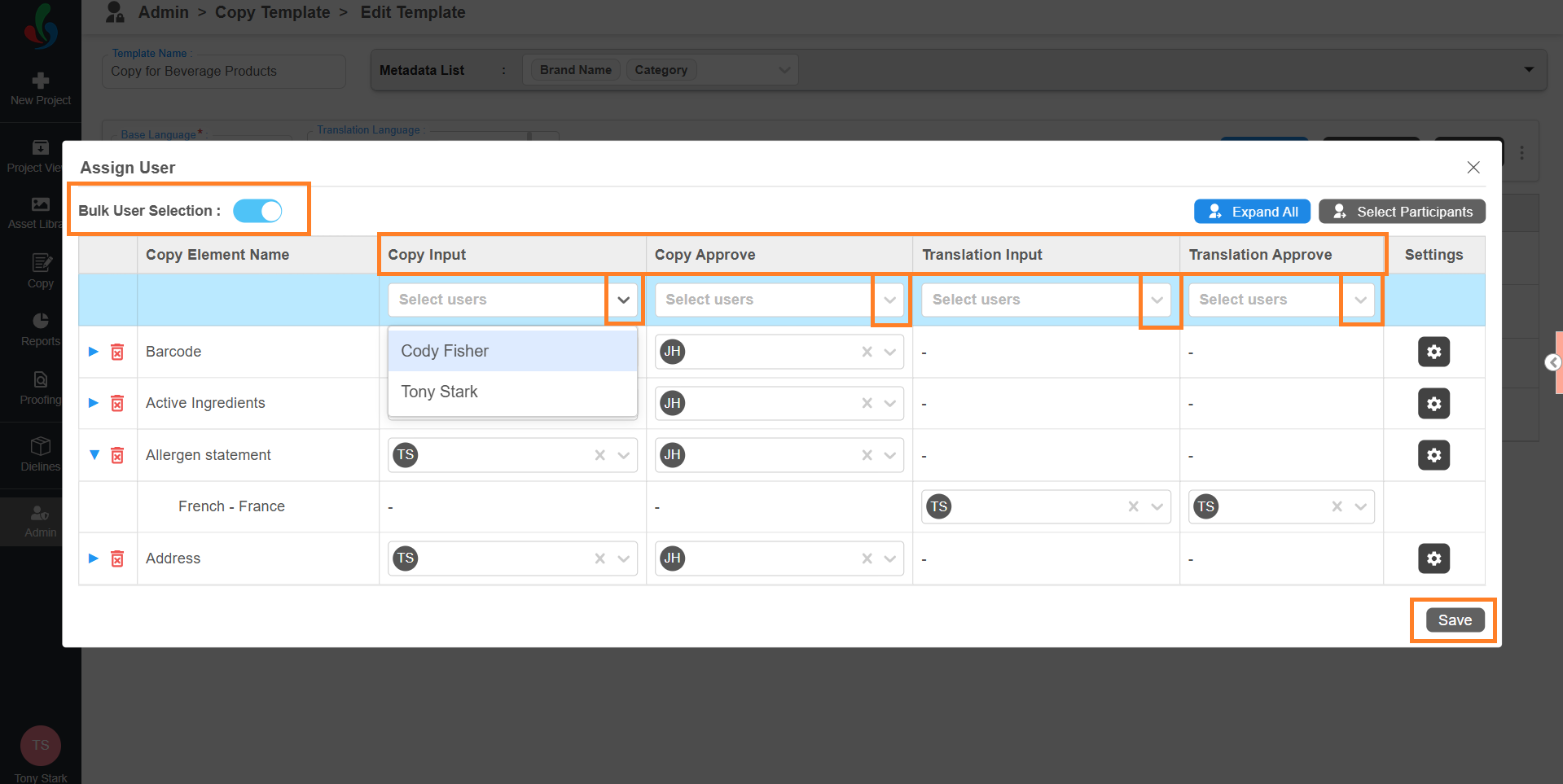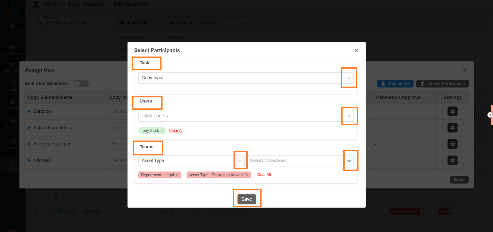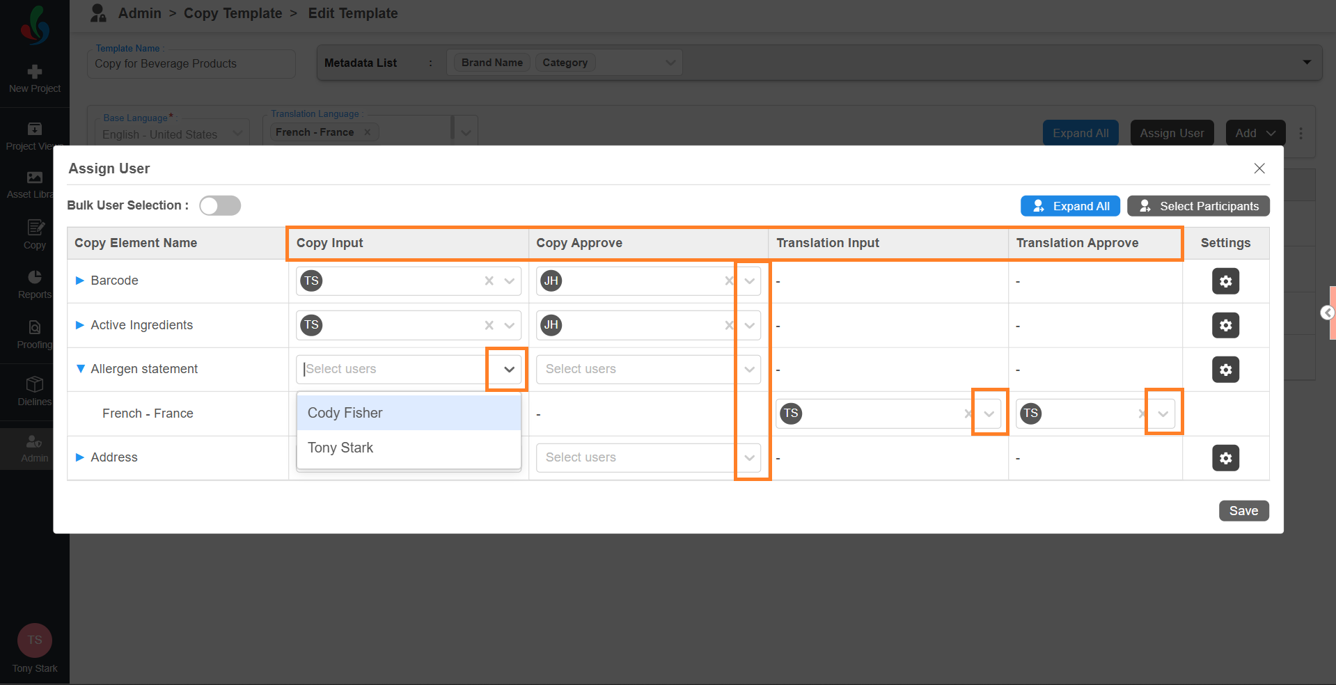 After task participants are configured, you can assign users to each element.- In the Assign User window, you’ll see all the added copy elements along with user selection fields for each task type.