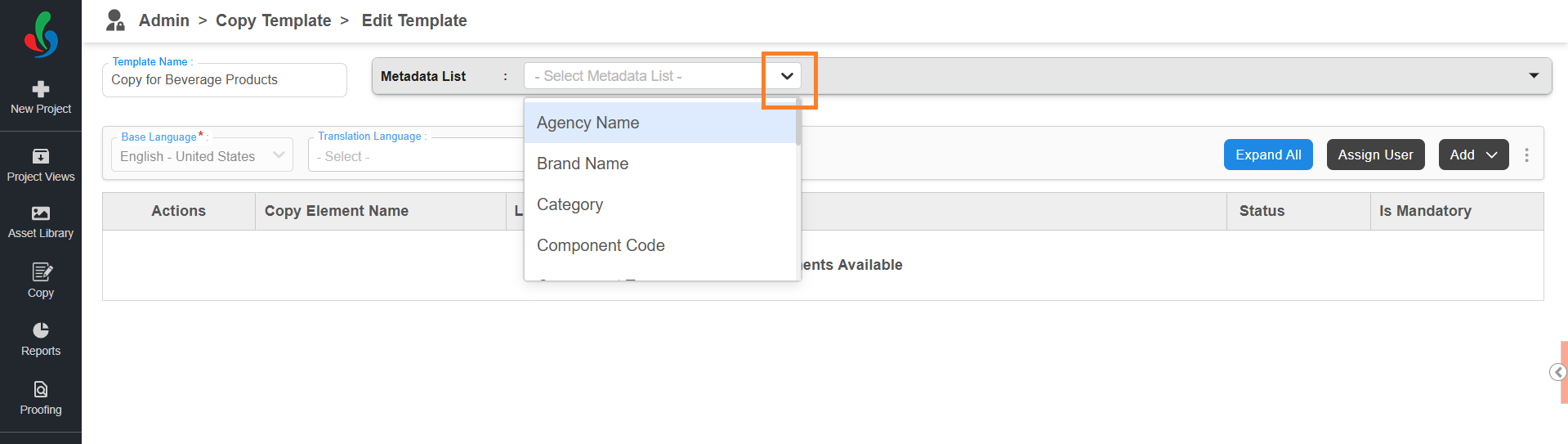 You can associate a Copy Template with specific project metadata. Metadata configuration helps the system identify when a template is applicable during project execution.