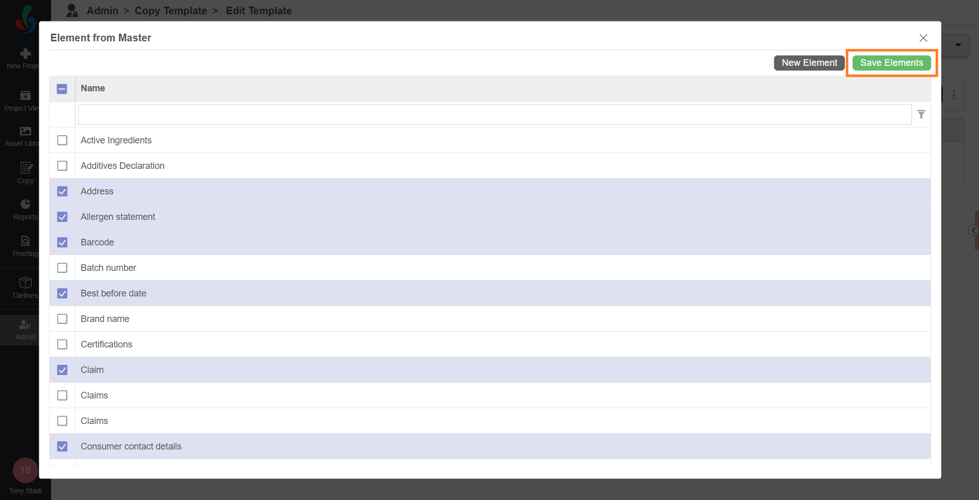 - Once all desired elements are selected, select Save Elements to add them to the copy template.
