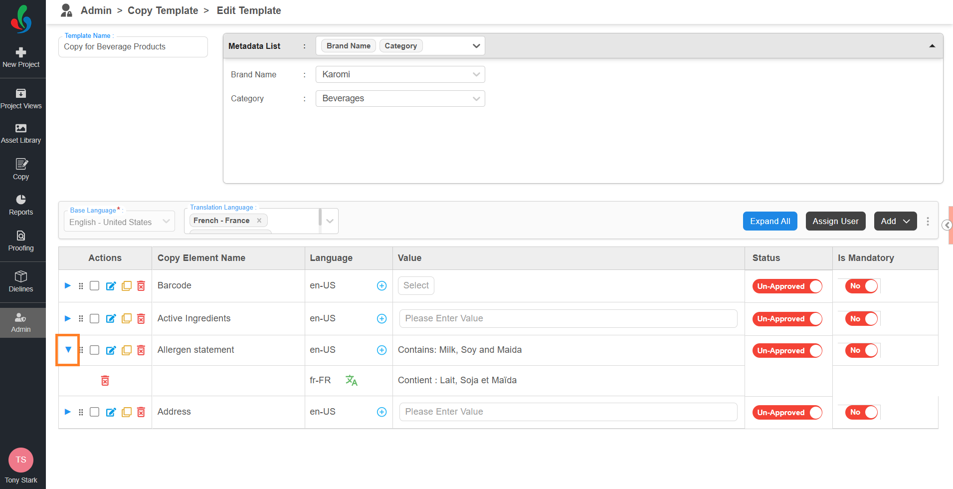 - You can expand each element using the ▶ expand icon to view and manage translation assignments.