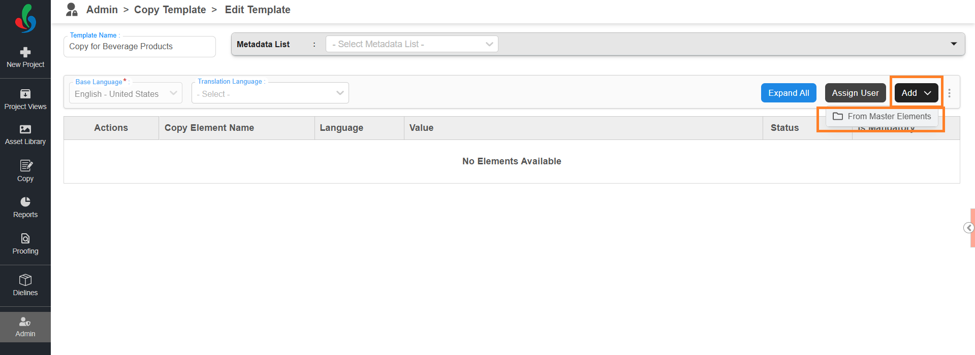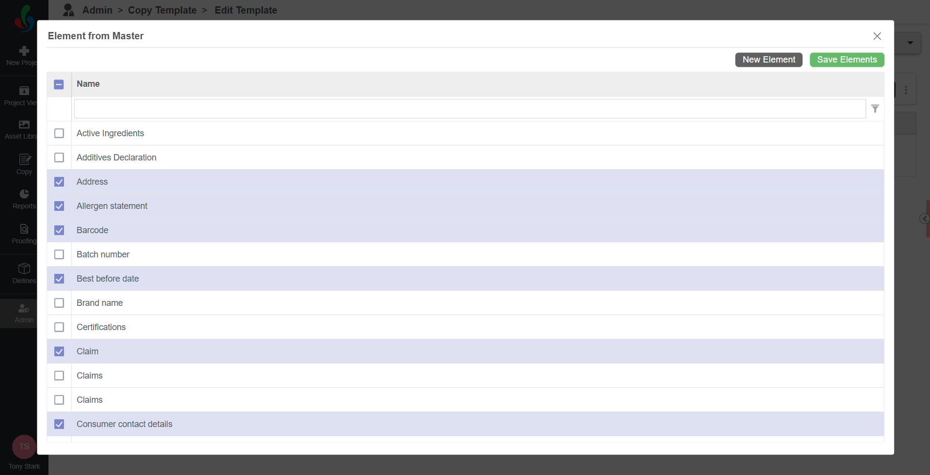 Note: To manage Master Data elements, refer to the Copy Elements section. - Select the elements you want to include in the template.