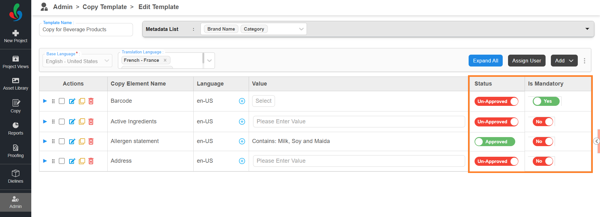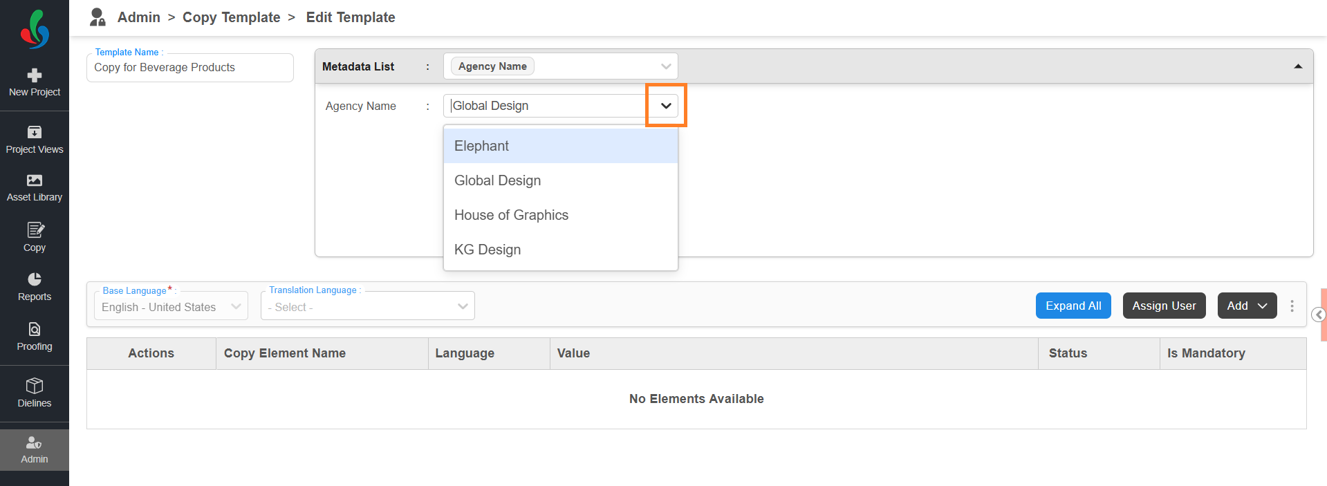 - In the Assign User window, you’ll see all the added copy elements along with user selection fields for each task type.