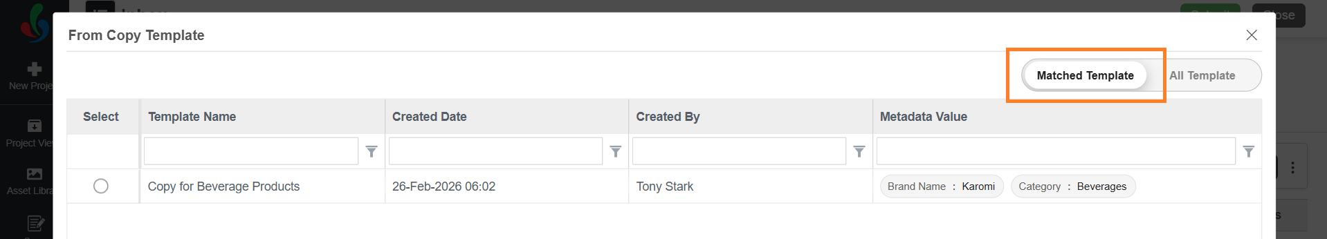 - Matched Templates – Only templates whose metadata matches the project