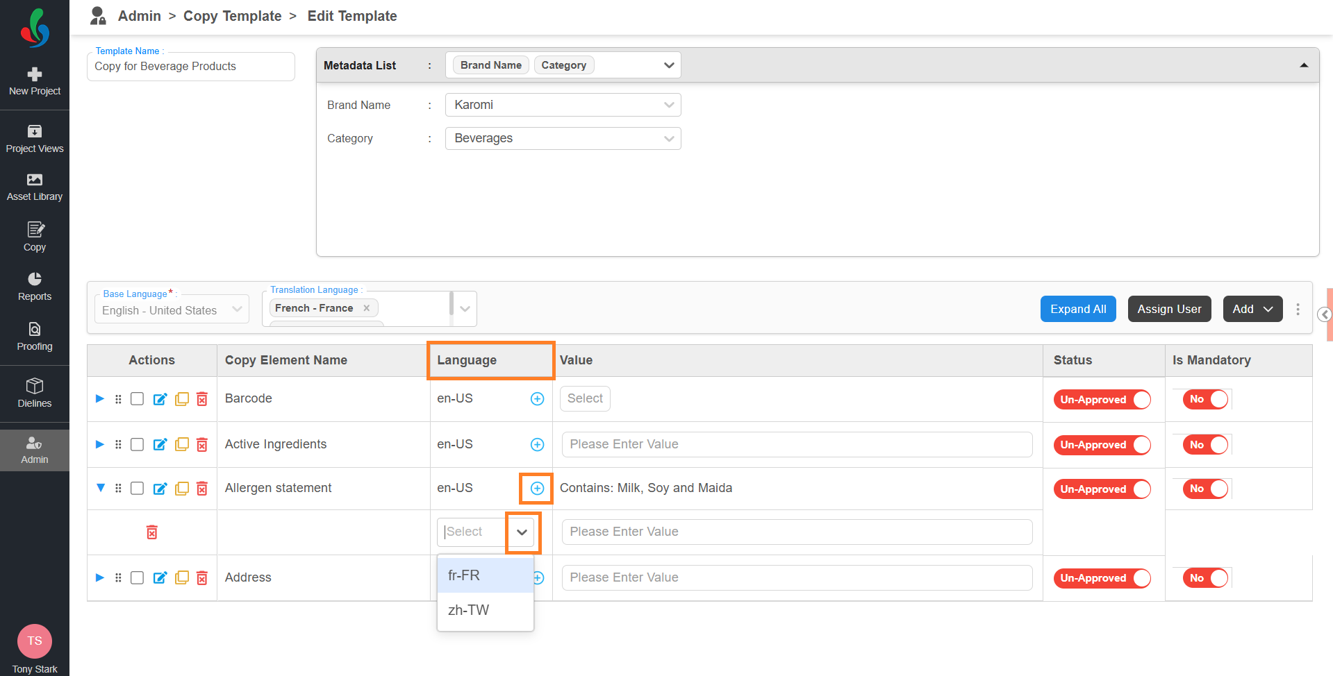 - You can assign different translation languages to different elements, or use the same one across all.