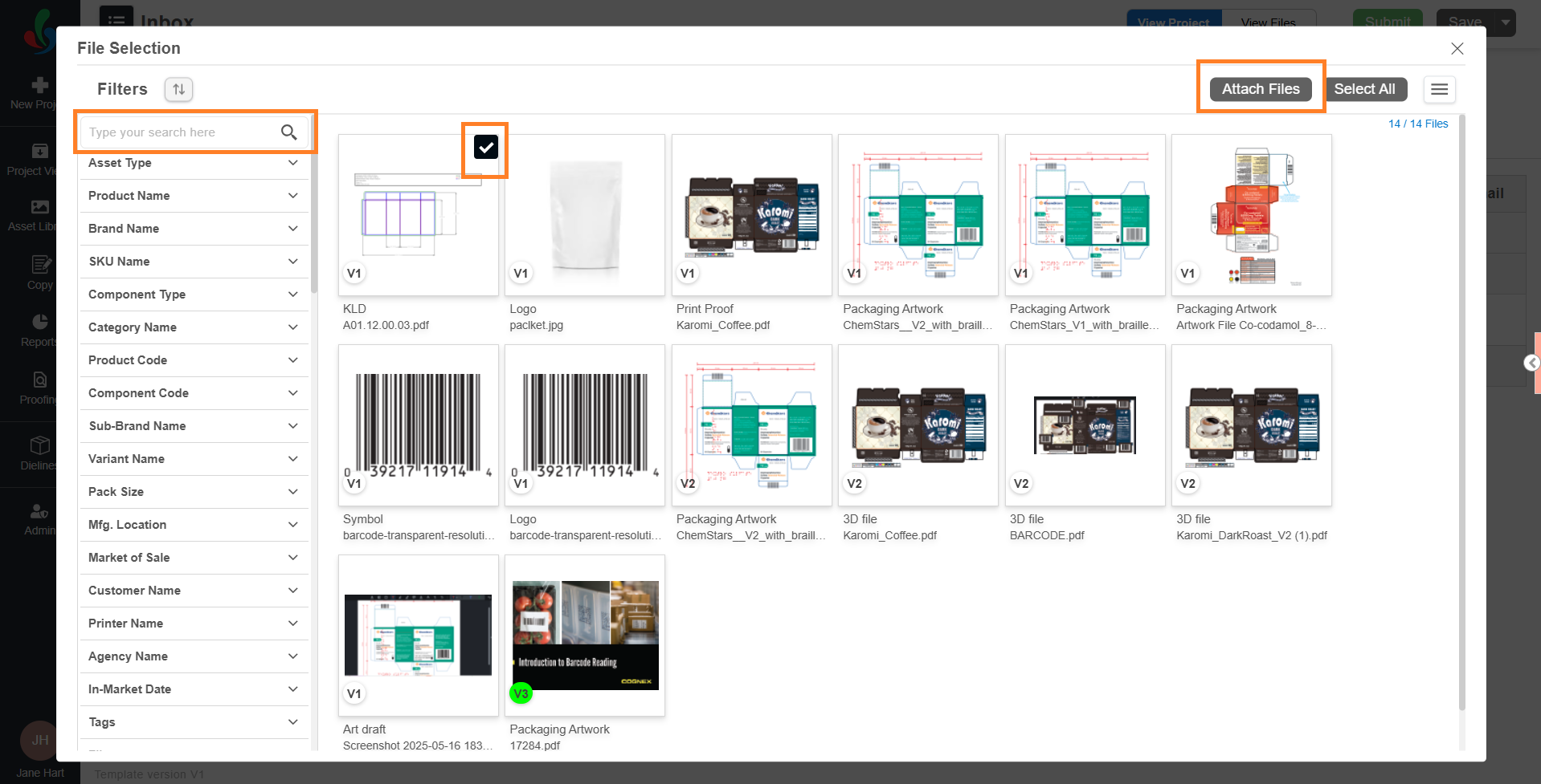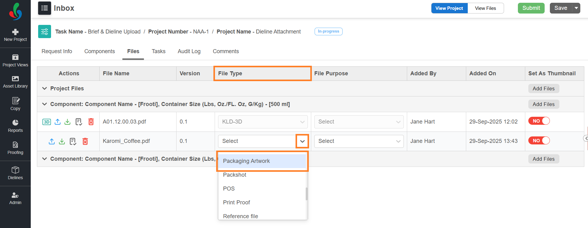 Note: Only Packaging Artwork file type can be overlaid on a dieline (KLD).- If the file is selected from the Asset Library, the File Type is auto-populated based on metadata and cannot be changed.