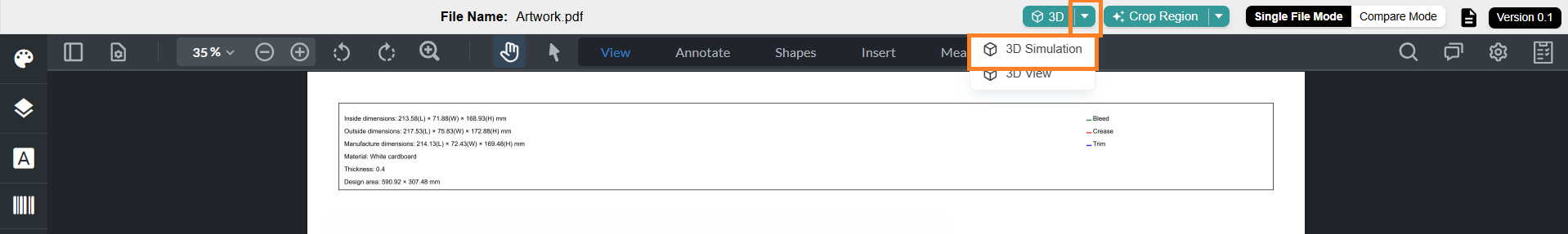 - Selecting the dieline 3D icon opens an instant 2D and 3D preview of the dieline (without artwork overlay) directly within the Files tab—no need to open the full Web Viewer.