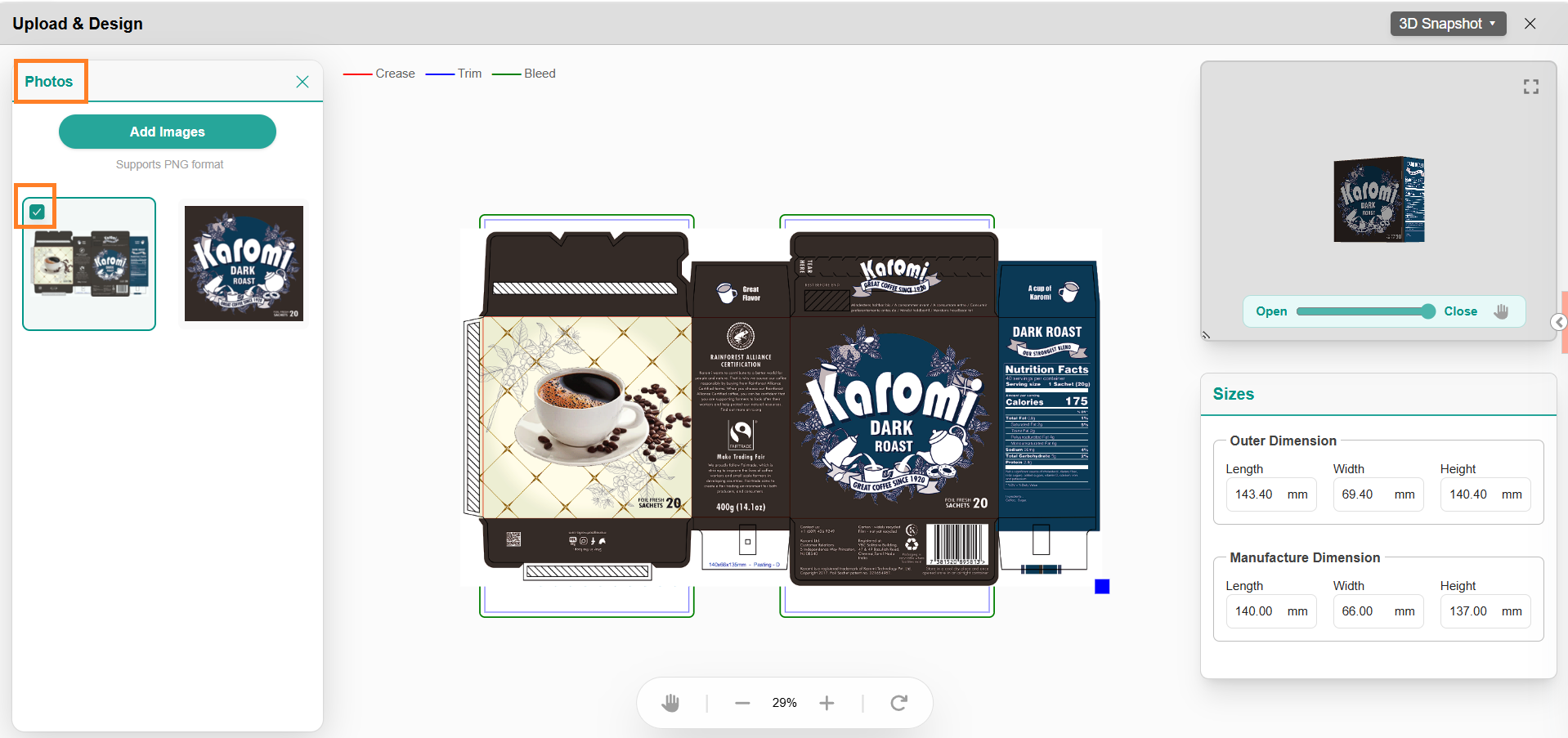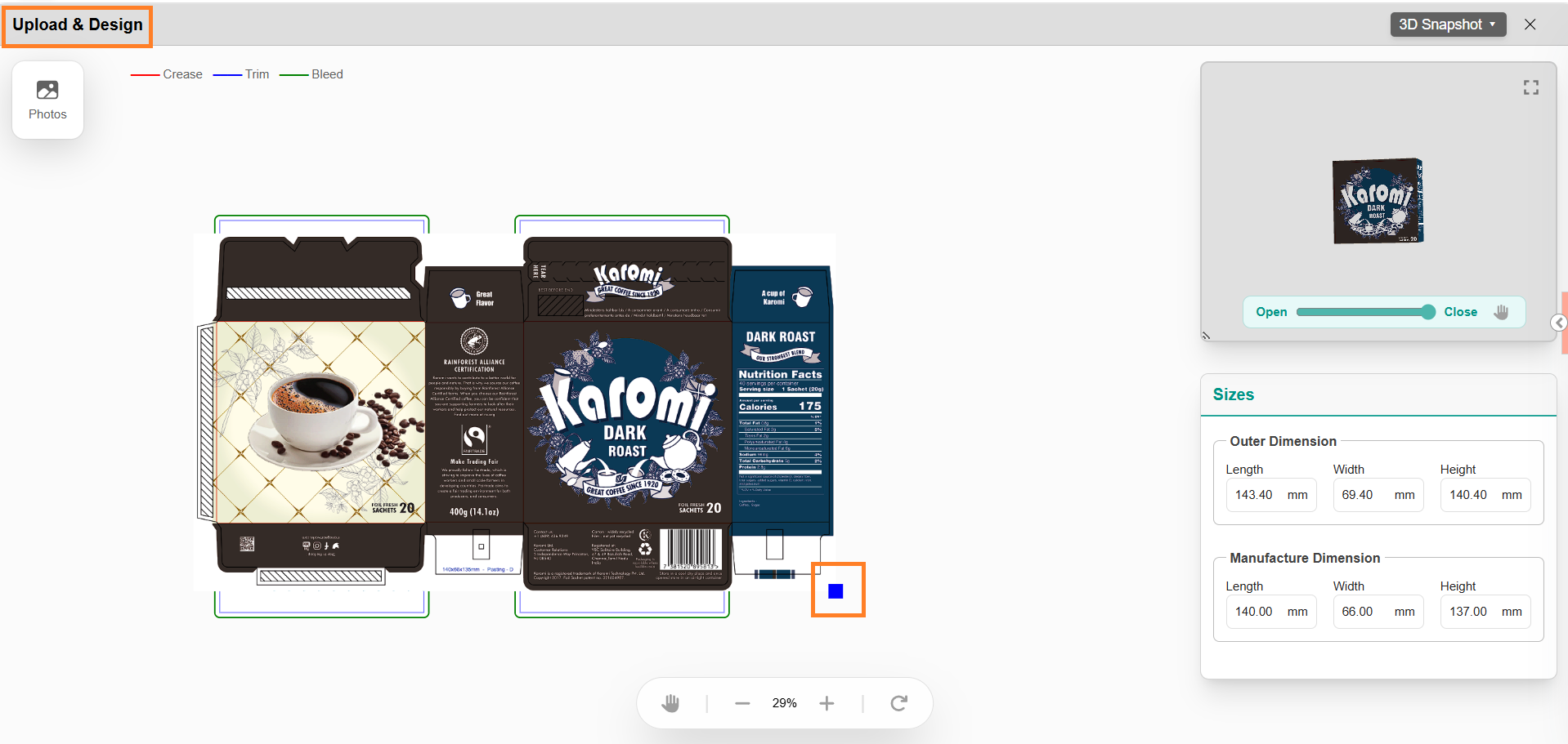 - The cropped area opens in the Upload & Design window, overlaid on the dieline.