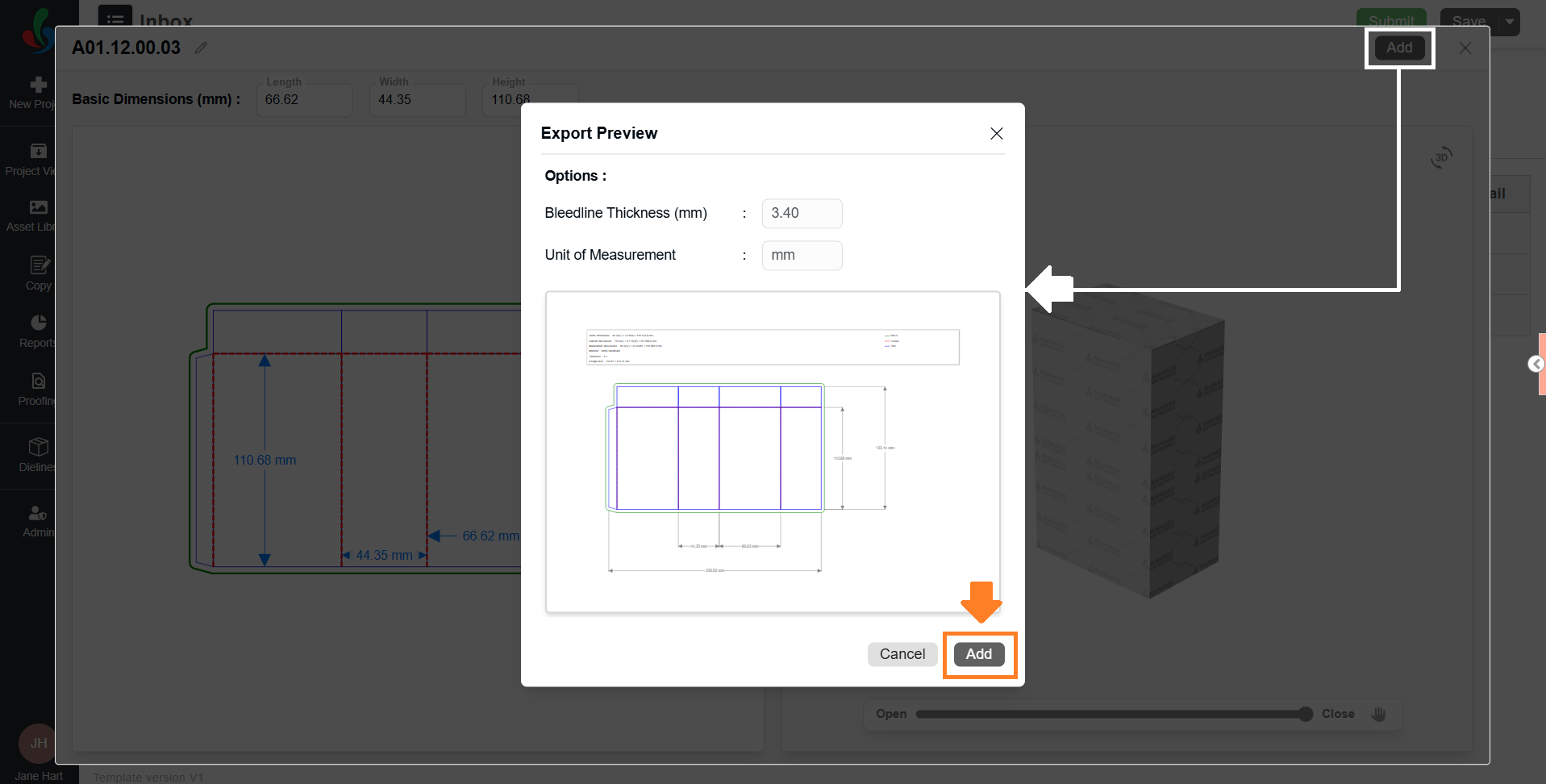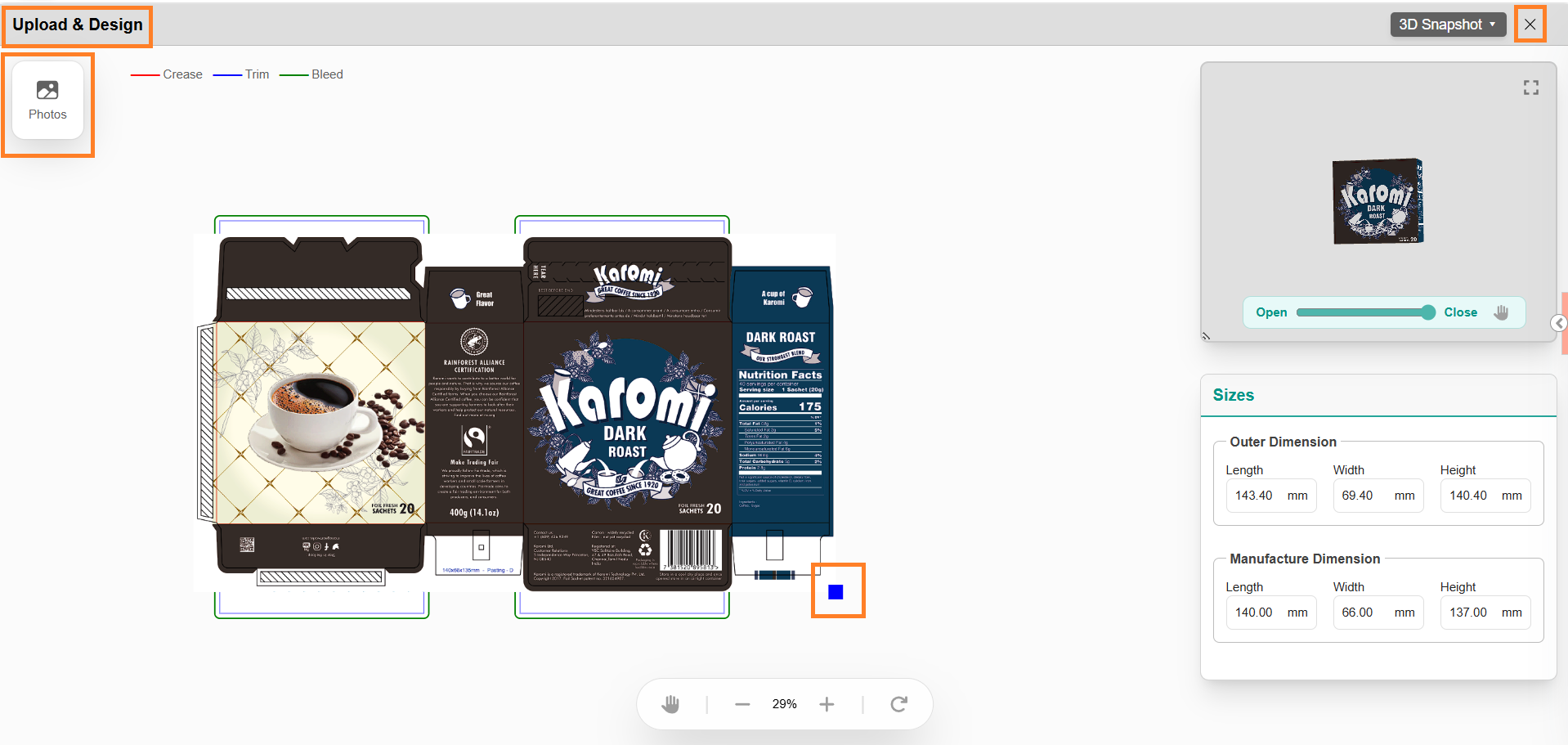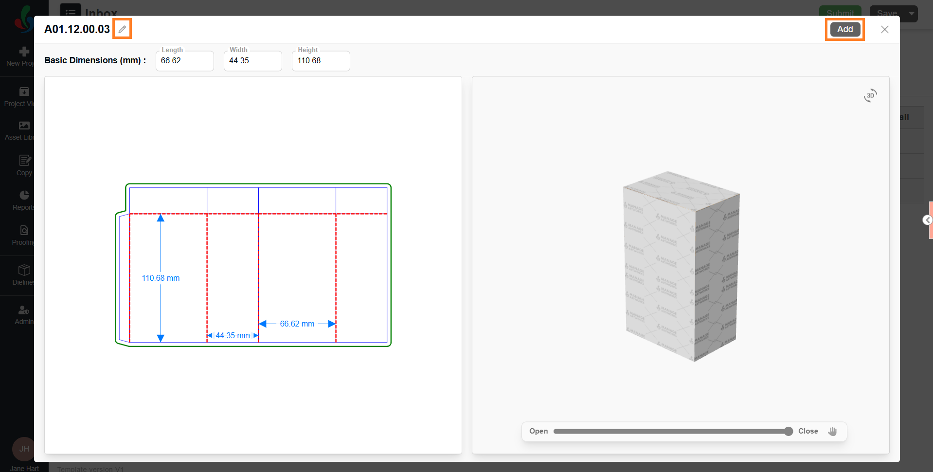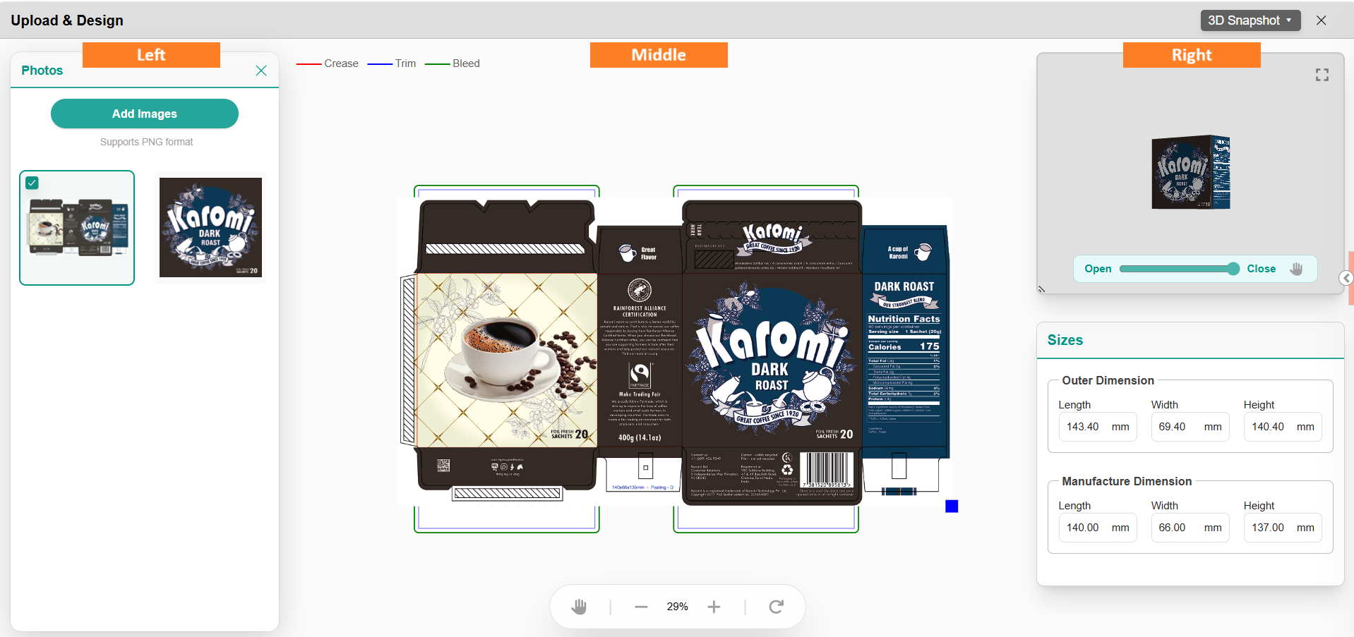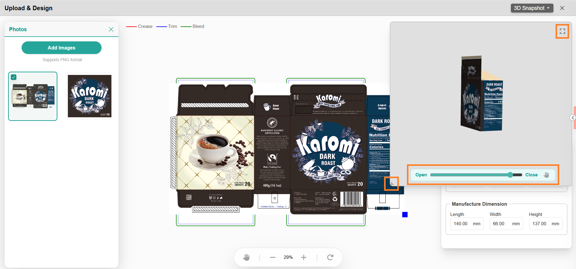 Right: 3D Preview & Controls | Visualize dieline in 3D with interaction features: - Slider for open/close simulation - Customization options only for appearance based on dieline type. Changing dimensions are not allowed |