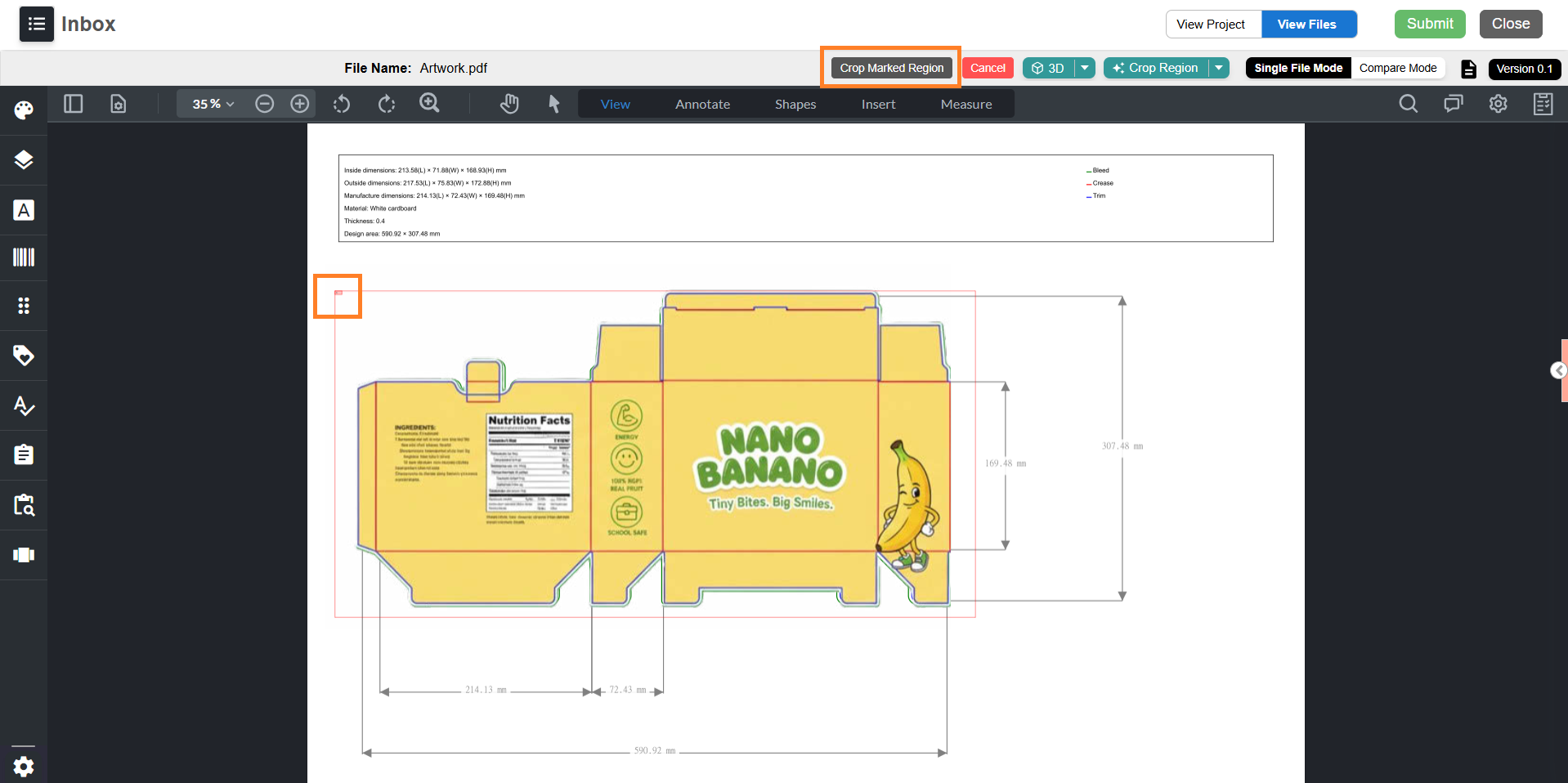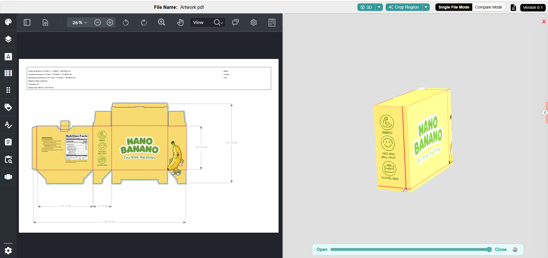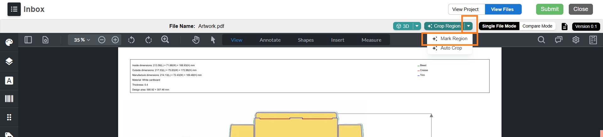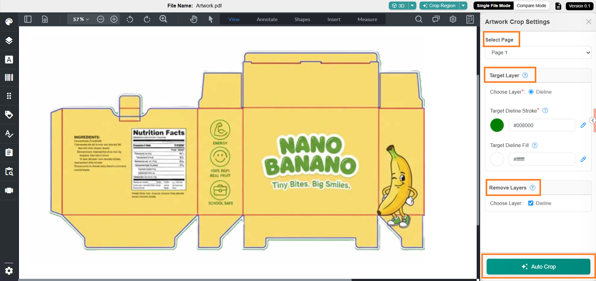 The Auto Crop feature automatically detects the dieline region and extracts the relevant artwork area for overlay or simulation. This functionality reduces manual effort and ensures accurate alignment between the artwork and the linked dieline.