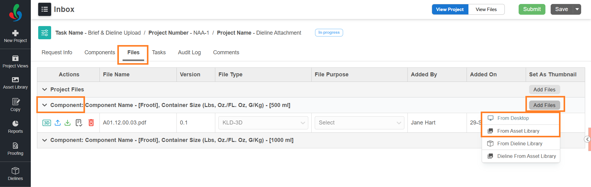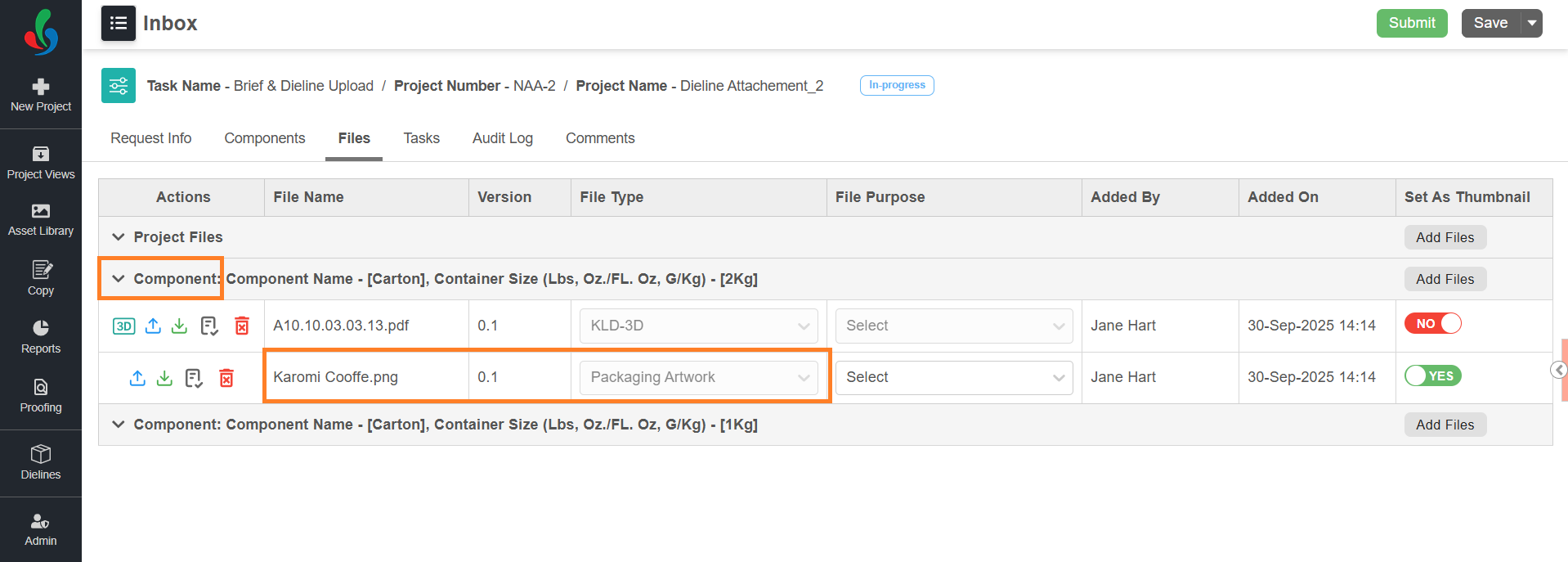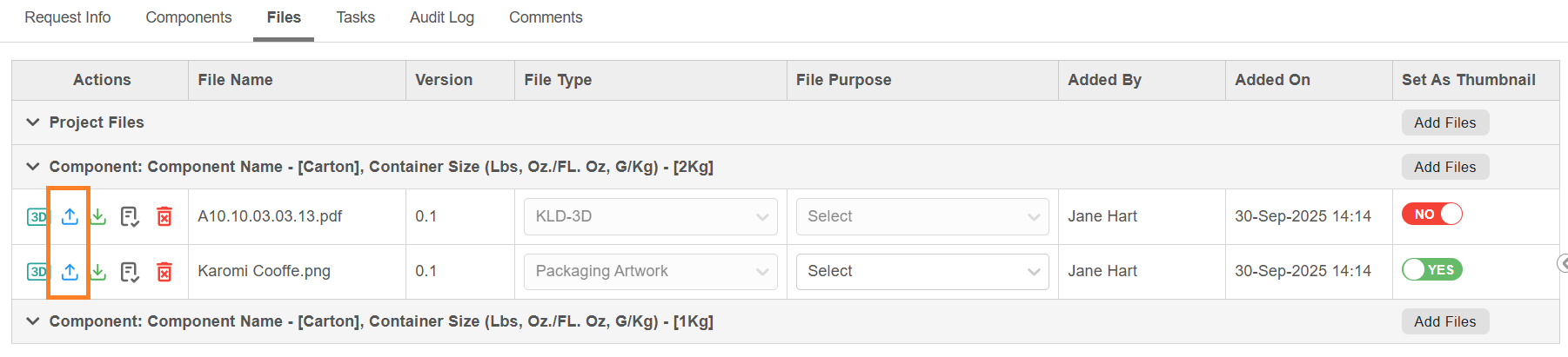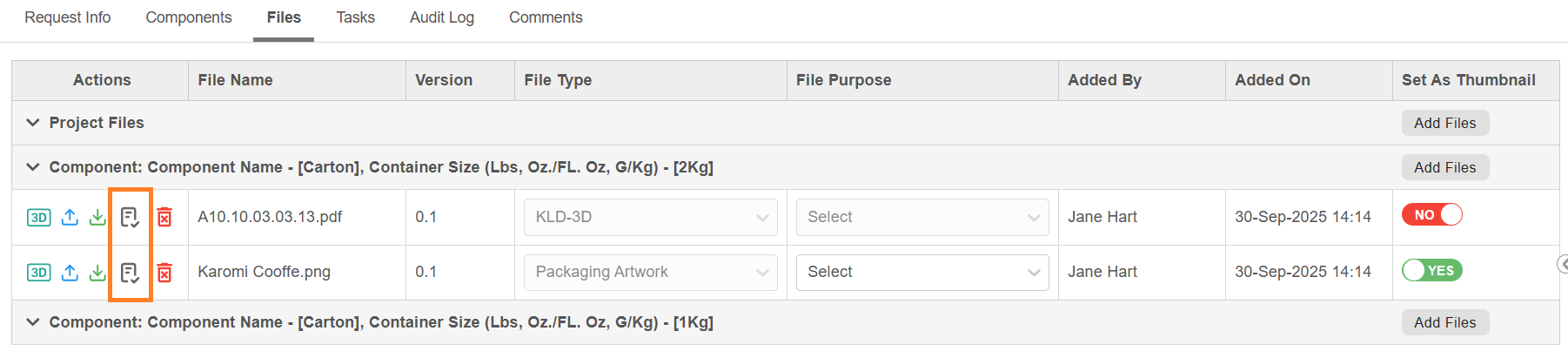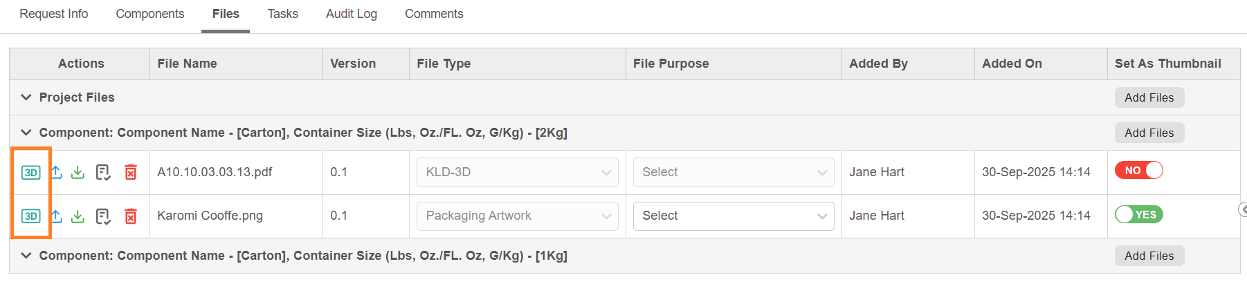 - Once the KLD (Dieline) is attached, a 3D Preview icon appears next to the KLD file in the Files tab.