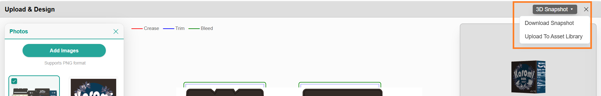 If needed, capture a snapshot of your 3D design. You can capture a snapshot of the 3D design by using the 3D Snapshot button. There are two ways to obtain the snapshot. Hover over the 3D Snapshot button, and two options will appear: Download Snapshot and Upload to Asset Library.