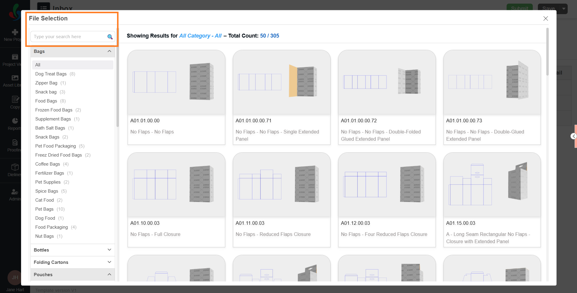 Note: Only published dielines from the Asset Library can be linked to a project. Customization is not allowed when using this method.- Select From Asset Library from the file source options.