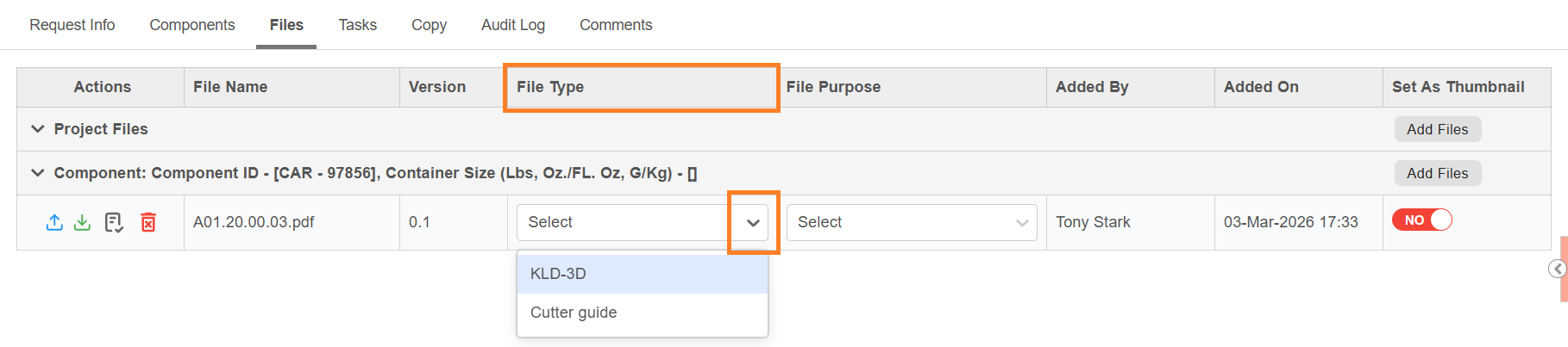 - After attaching the dieline, select the File Type drop-down corresponding to the attached file and choose the required file type from the list.