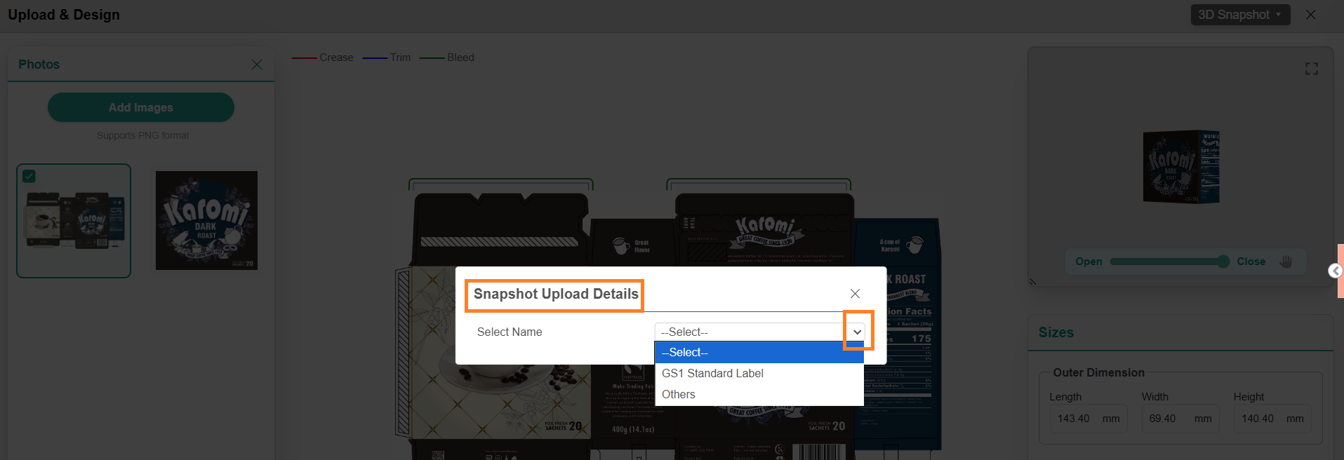 Note: The dieline will be added to the project with this custom name. If the dieline is later published to the Asset Library, the same custom name will be retained and reflected there. - Customization options differ based on the selected dieline type. For more details on customization, refer to the Customization Options.