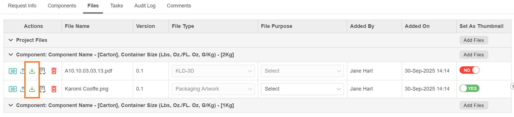 - For Packaging Artwork: Click the Download icon next to the artwork file to download it directly to your device.