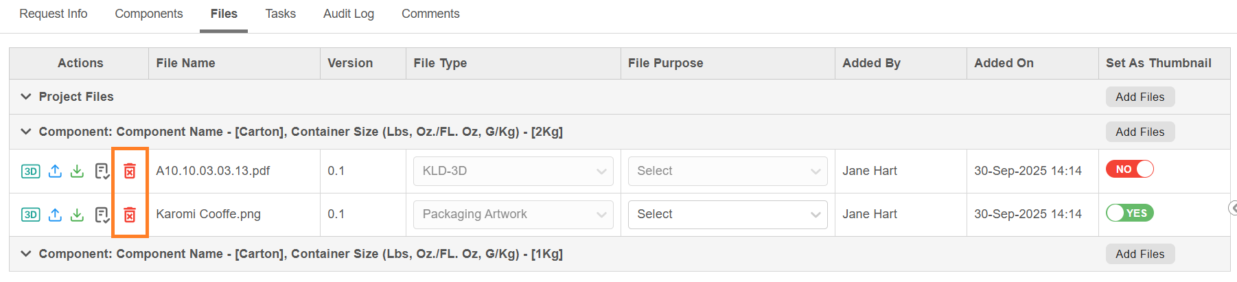 - Click the Delete icon next to the dieline file, then confirm by clicking OK in the confirmation dialog.