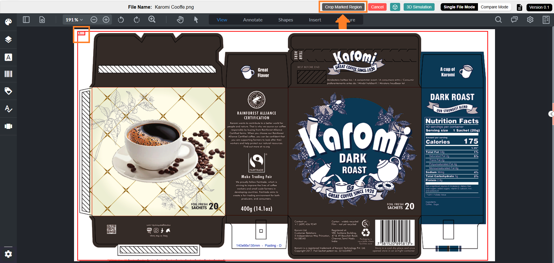 Note: Typically, users mark the entire artwork area for overlay. However, the system allows marking any specific region. - Click Crop Marked Region.