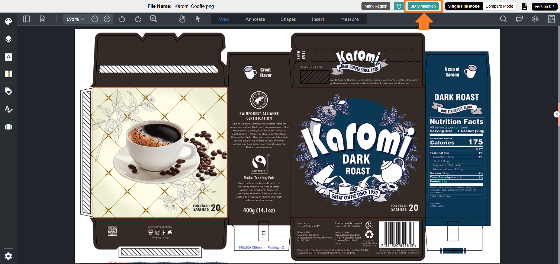 Clicking the 3D Simulation button in the Web Viewer opens the Upload & Design window, where you can add overlays and preview the dieline in 3D. For details, refer to Upload & Design Window.