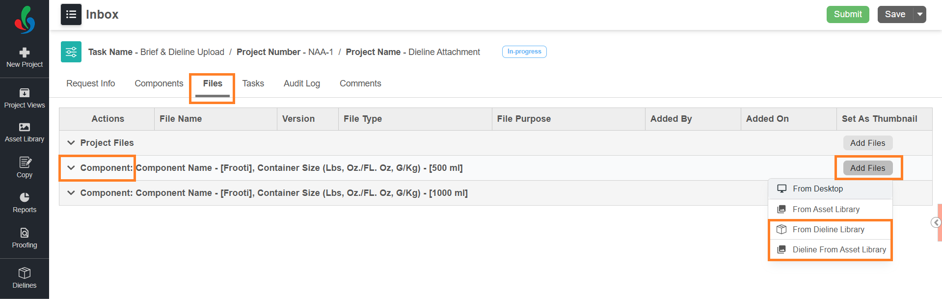 Note: This article explains how to attach a dieline after project initiation. You can also attach a dieline before initiation in the Files tab, using the same steps (start from Step 02). For details on creating a new project, see the Start a New Project section. This article focuses specifically on how to attach and manage a dieline within a project, and how to link it with packaging artwork. It does not provide step-by-step instructions for completing a workflow or project using a dieline. Before proceeding with the Dieline Workflow, it is recommended that you have a clear understanding of how workflows function in ManageArtworks. |