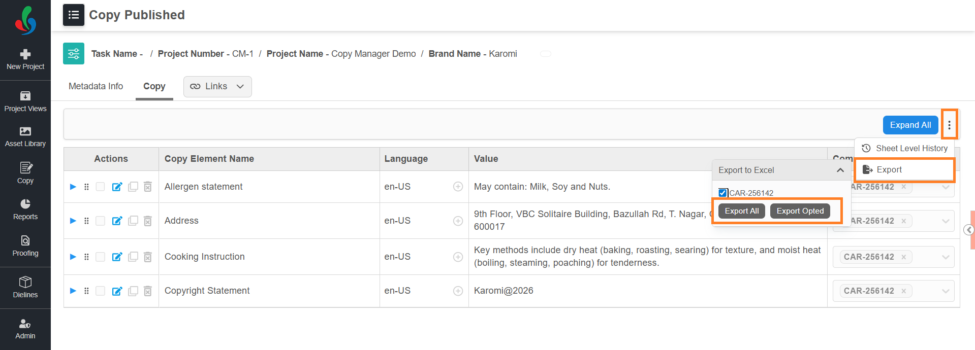 Once a project is completed, the associated copy content is compiled and published as a Copy Sheet. These published copy sheets can be accessed from a dedicated module called Copy.