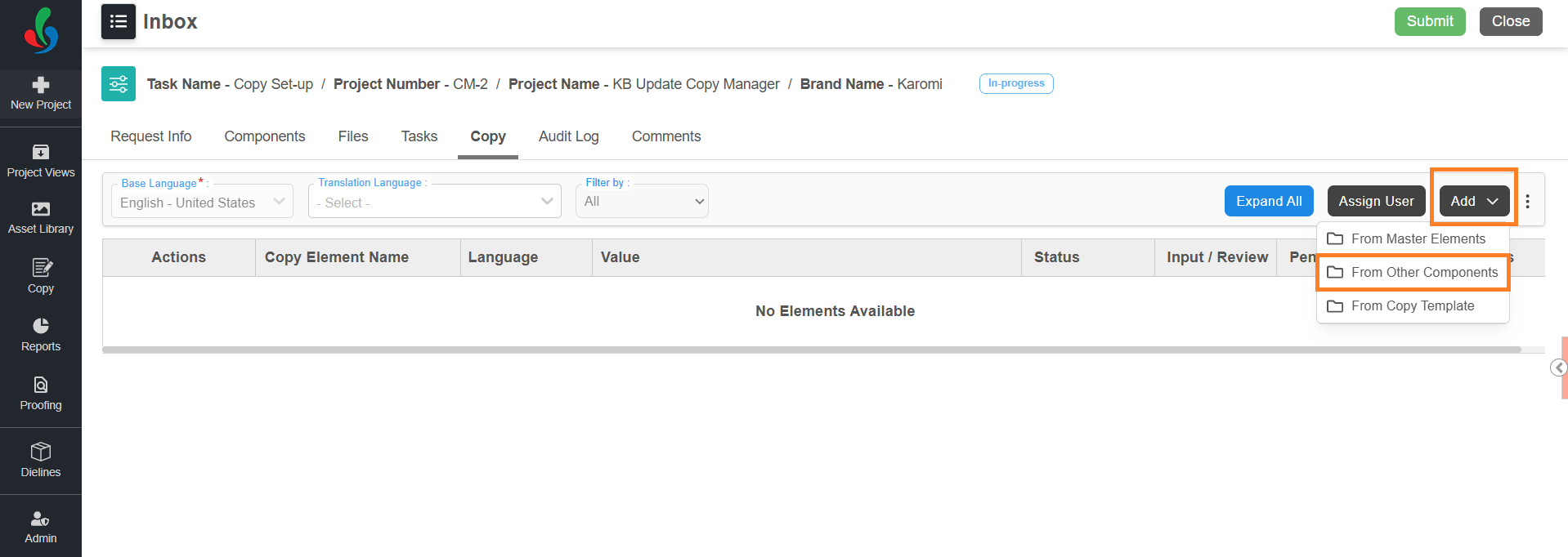 The Copy Manager workflow is tightly integrated with the overall project workflow in ManageArtworks. When a project is initiated using a workflow template configured with Copy Manager, a Copy tab becomes available within the project. This tab acts as the central workspace for performing all copy-related activities throughout the project lifecycle.