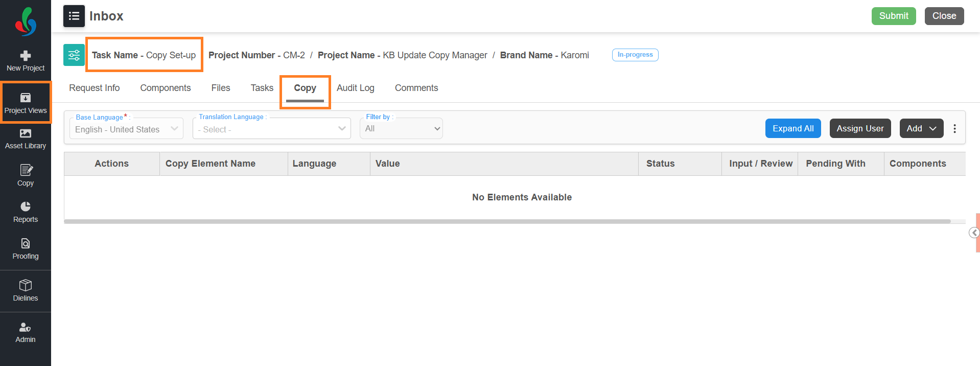 The Copy tab appears automatically when the project is initiated using a workflow template configured with Copy Manager. This tab serves as the workspace for completing all copy-related tasks in the workflow. At this stage:
