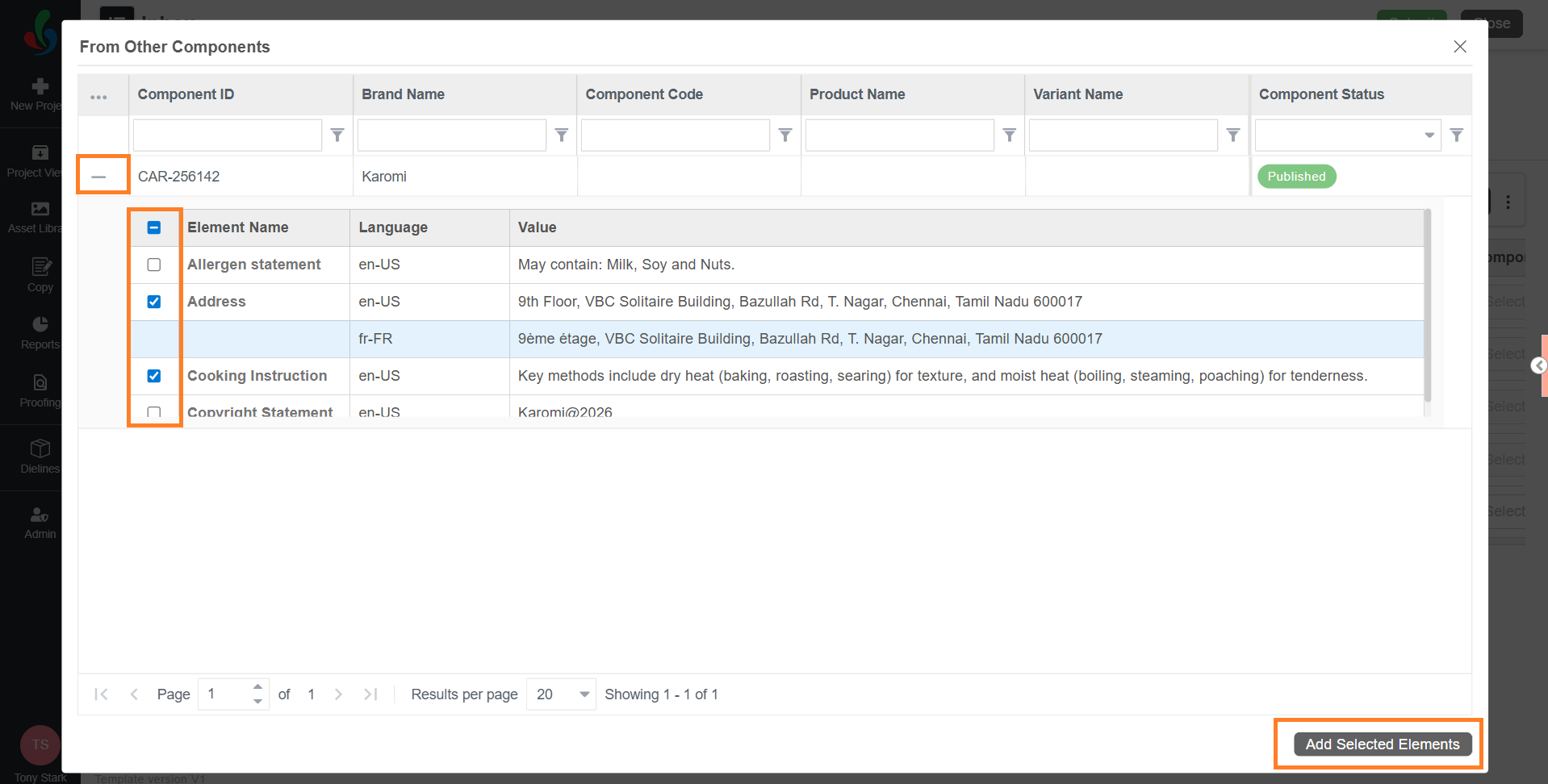 - Once all desired elements are selected, select Add Selected Elements to add them to the project.